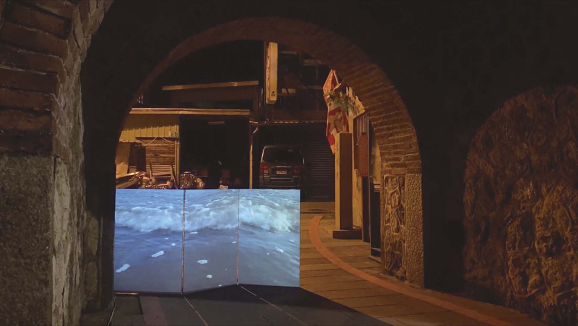 這座水的城市在張根耀2020年的作品《內海―陸浮、鯨、海屏風》那裡局部地重現了。在市區特定地點的巷弄內,在像是摺頁般攤開的屏風上投影海與灘岸的影像。屏風之折疊與攤開的效果,帶有時空摺疊感,宛如將曾為台江內海之地,那段已被永遠闔上的歷史,再次打開。同時,就像作品標題《內海―陸浮、鯨、海屏風》所囊括的主題,以曾於運送過程中因體內氣體膨脹而在西門路爆炸的擱淺抹香鯨屍體為另一軸線,影像遊走於半遺棄的鯨豚館、灘岸塑料形成的鯨豚擱淺意象、巷弄中海的往事,疊合著西門路曾為府城海岸線之往昔。在以海岸線為疆域的種種想像性連結裡,除了是關於海岸線範圍內人文地理與環境地貌之變遷,也是對海岸線之外某種遙想「鯤鯓」作為古代台南外海那些形似大魚之背脊的潟湖沙洲景觀,並演變為今日台南多處沿海地名之遺留的當代考古。