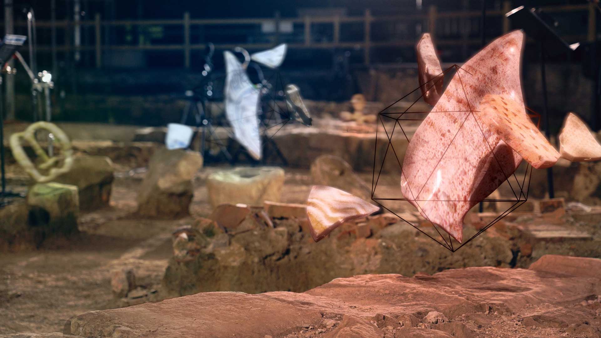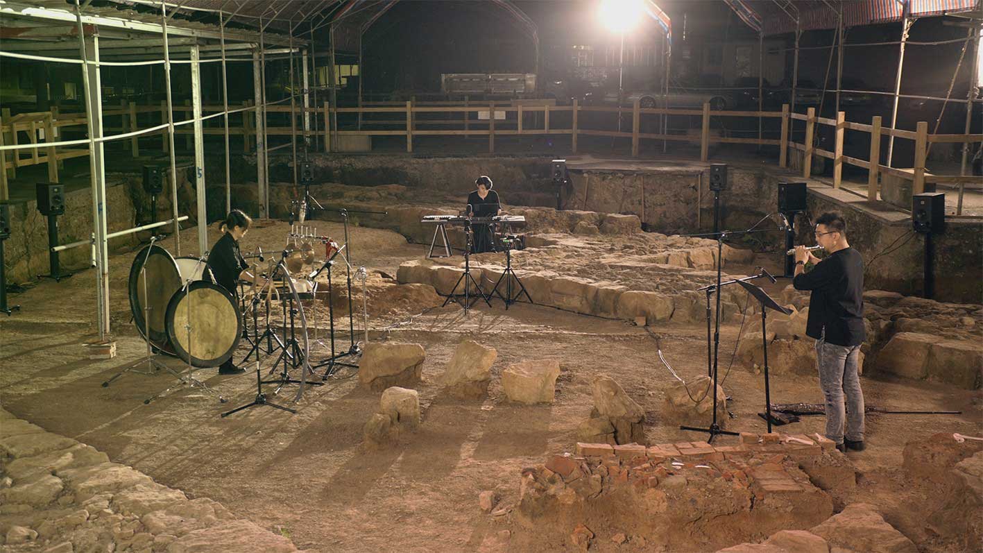 這些與考古行動貼合的過程,也成為「在聖堂裡的一場演出」一展中最主要的作品《在聖堂裡的一場演出》。許家維邀請了考古學家與作曲家共同創作,作曲家依照考古的過程發現的的鹿角、鐵器等物質做成嶄新的樂器,曲目則是參照17世紀西班牙的宗教音樂曲風,並參考日治時期一位日本人類學家,針對此區域的原住民做過田野錄音中的祭詞,以及現今考古現場周邊宮廟遶境的元素等。將這些不同時空,但可能都存在過此區域的聲響、元素進行控盤播放。當演奏家在古教堂遺址現場演奏時,這些聲響會再即時互動與回放,完成這場共同創作16分鐘的現場演出。