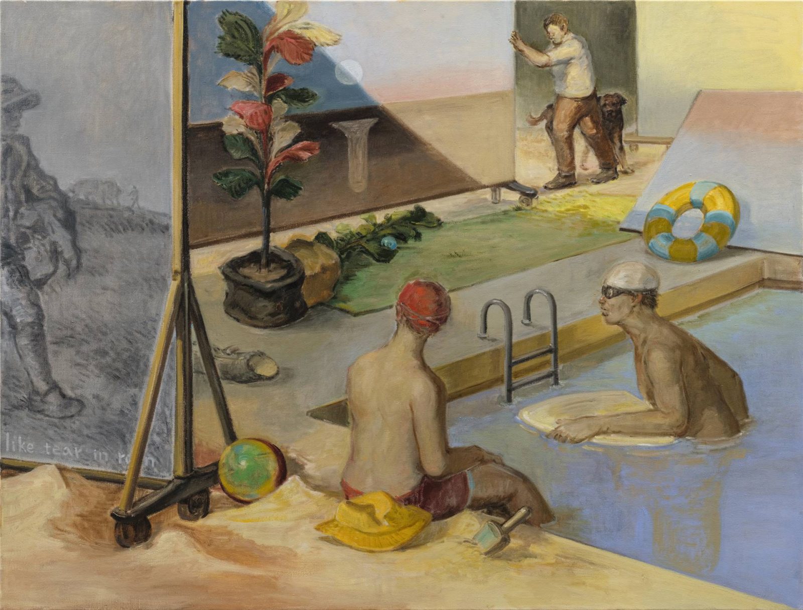 巴黎的駐村經驗,體驗夏季日照的漫長,讓陳敬元的時間感開始紊亂,而對於異域的觀察,也讓他從過去巴洛克古典式繪畫技巧,佐以內在隱喻的繪畫主題,開始有了轉變。其中「Triptych」三聯幅系列如同一種過場與中繼,陳敬元開始在作品中出現過去沒有在繪畫表現中出現的垂直與水平線條,他藉由可移動「畫屏」的出現,創造了動態的劇目與背景。「畫屏」有美化、協調、分隔空間的曖昧作用,也無疑鬆動他過往習慣主題置中、戲劇光線的畫面配置。