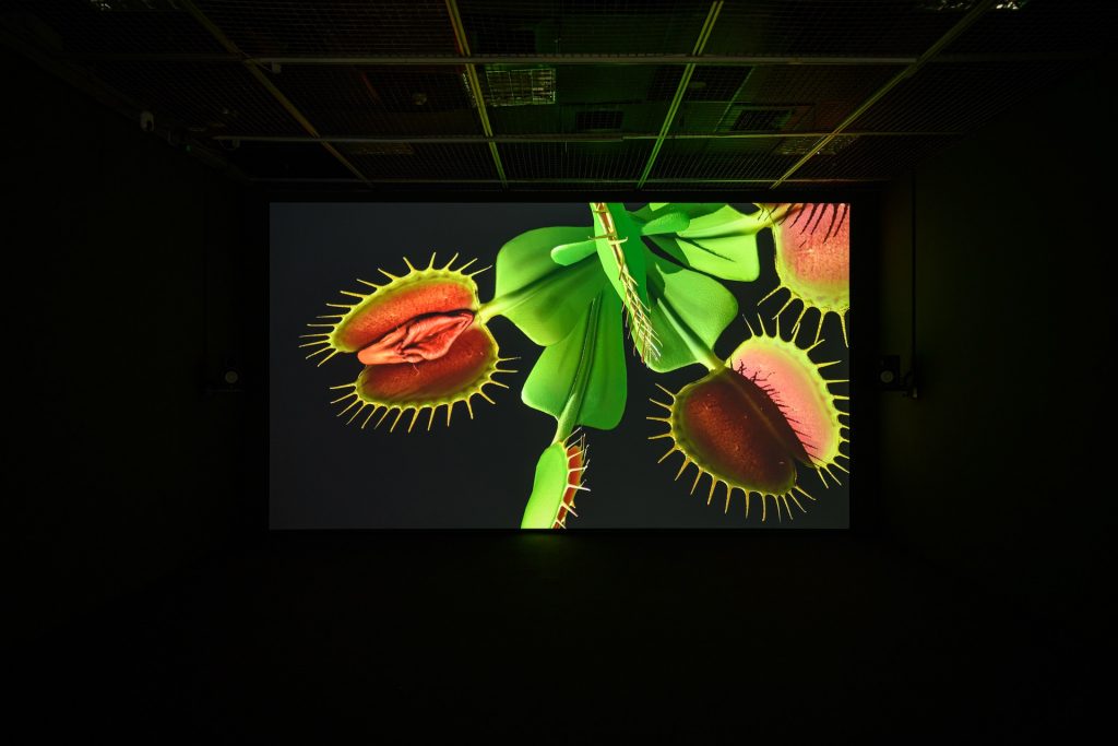 吳梓寧的《捕蠅草人改造計畫01》(2018)則從性別角度切入,嘗試引用「捕蠅草消化液」與人類性功能相似之組織結構,呈現生物基因混種改造與人工器官培養的模擬,並藉由捕蠅草開合與女性生殖器的對照,翻轉植物在生物階層中的低等歸類,以及其作為女性被動的象徵迷思連結;她另在《網路後世—基因求籤販賣機》(2016)中,探問「宗教命定論」的八字,如何在基因編輯技術的發展下,進階成「科技命定論」惟DNA是問的新迷信。藝術家也在展間外以染色體圖像,擬仿哥德式教堂的彩繪花窗,象徵基因工程上升至宗教信仰的權力擴張。