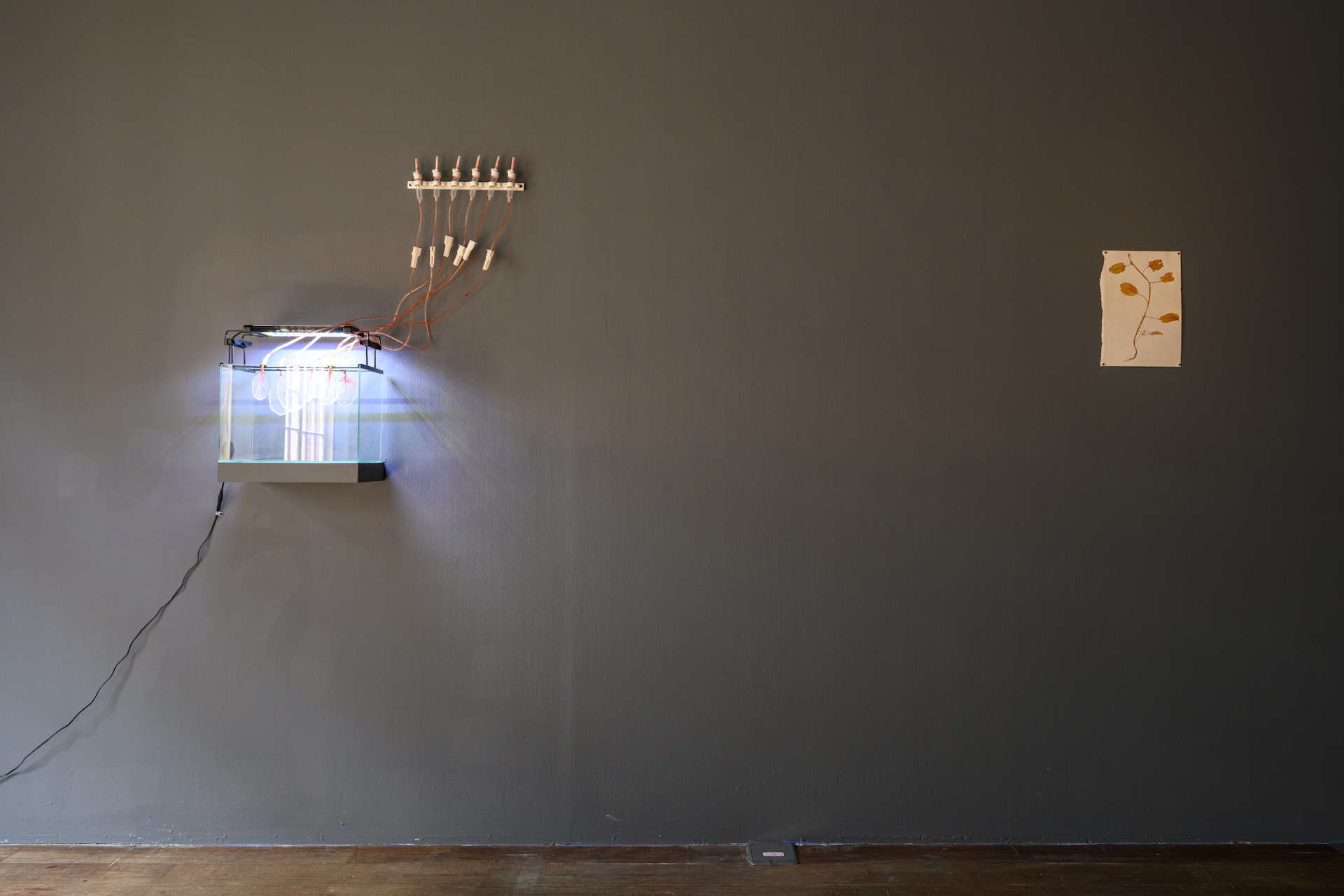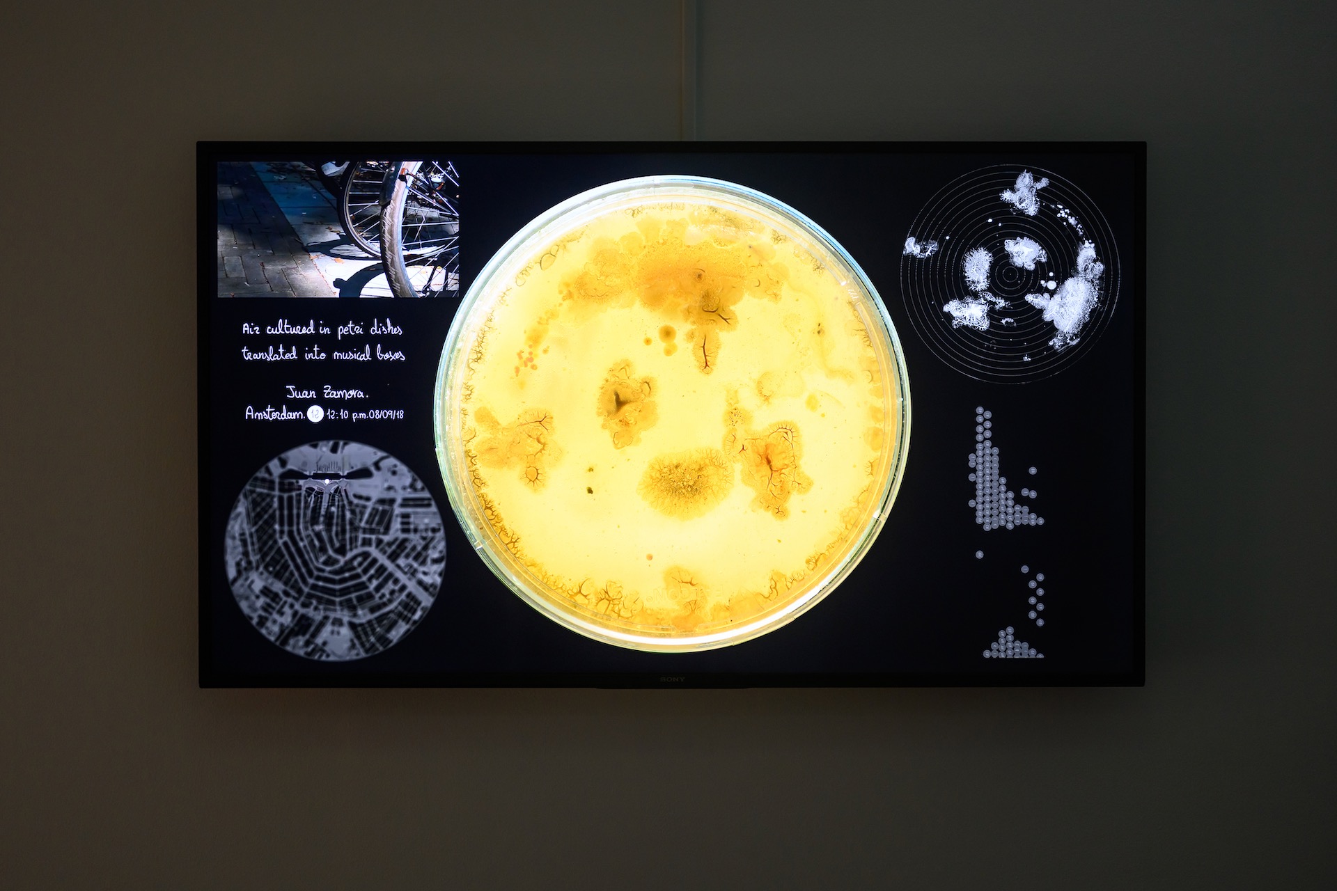 胡安・薩摩拉(Juan Zamora)的《氣態文化》(Air Cultures,2018)則再將「UVIVF」歌德式科學方法的視覺觀察,推進至聽覺感知層次,將不可見的微生物聚落之蔓延轉化為樂譜上的音符;他並在《樹棲》(Habitar un árbol / Cantar la tierra,2021)中反思科技技術的發展,如何改變人們與自然世界的互動關係,辯證真實與數位世界的落差:當前者中的樹木因都市開發而被砍伐後,卻以影像持續留存於後者的Google Street View中,作為實體消失後「此曾在」的證據。而展場中以土壤排成的QR CODE,在此彷彿作為對自然的悼念般,昭示螢幕介面已成為當代世界認識的新途;薩摩拉另外在《移植》(Transplant,2017-2021)中展現了時下醫療技術,如何透過脫細胞技術,保留植物葉片上的有機組織結構,再注入培養的血液細胞,用作如心臟等器官治療上。