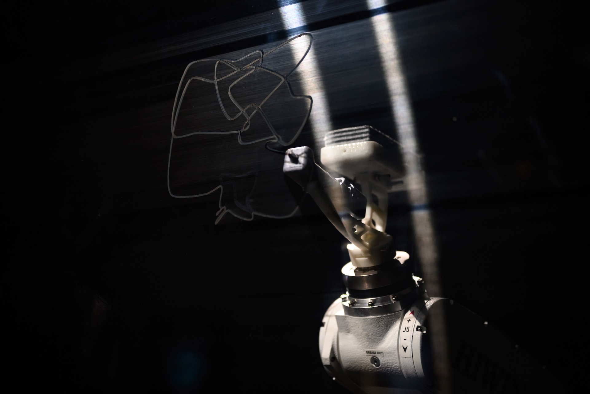 首先,一樓的各展間重於生命構成狀態與自然世界面貌的「現形」,亦即新的科技視野如何提供了新的觀看語彙、方式、系統與介面。展覽入口處勞夫.貝克(Ralf Baecker)的《網路的自然史/軟機械》(A Natural History of Networks / Soft Machine,2021)即透過攝影機捕捉液態金屬合金與化學溶液在導入電流下產生的混合現象,並以演算法創造一個動態流體的微觀世界,模擬地球生命誕生緣起的化學變化與能量交換,進而再現網路與雲端世界中全新的創世紀過程;接著,克雷格.布洛(Craig P. Burrows)的「UVIVF植物攝影」系列(2017-2020)透過紫外線誘發可見的螢光攝影,顯影我們肉眼不可見的植物訊息,賦予人類更細微的生命觀察與認識;而相較於前二者以科學技術模擬或觀察自然演化,「UVIVF」對面玻璃窗中鄭先喻的《生命遊戲》(2022),面向1970年發明的細胞自動機,如何從對生命演化初期的模擬研究,逐步踏入藝術創作的美學範疇。而這般演化更迭又在科技技術的發展中持續加速,如同窗內的機器手臂在演算規則控制下,將細胞的圖像進行塗繪與抹去,反反覆覆。