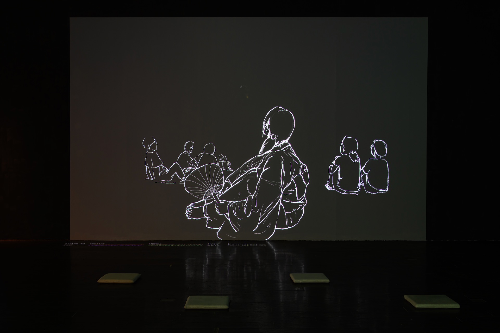 而隨著加密藝術交易市場的蓬勃活絡,黃新三件作品則更直接地使用NFT的公開交易資料進行創作,嘗試回應此一文化趨勢,並創發藝術家所期許的「活著的作品」:《綻》(2021)即時撈取Tezos鏈上Hic et nunc賣場的交易資料,當NFT交易產生時,影像上即會綻放一發煙火,其造型和交易的金額有關,顏色則隨著買家、賣家的錢包地址而改變。銀幕在此成了一巧妙的結界:數位世界的煙火雖只發生於影框內,觀眾卻也得在實體物理空間中,隨著影中的動畫人物背影一同觀賞;該作同時也隨煙火標示出相關出交易資訊,文字卻在展場中超越了既有的物理維度,溢出螢幕的2D平面。觀看與展呈的設計在在辯證著實體物理空間與雲端數位空間的並存與界線,乃至跨越的空間想像。
