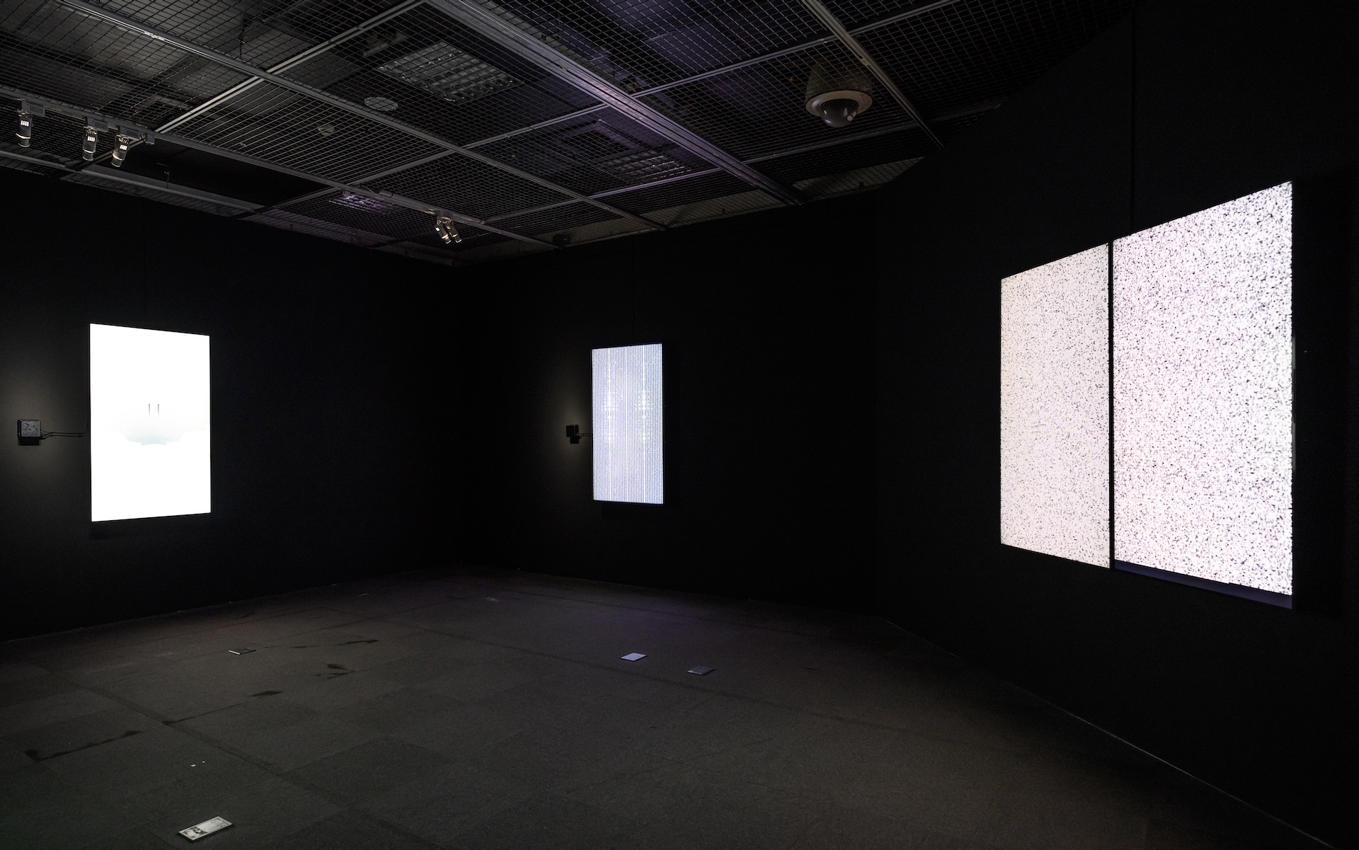 如同科技技術的往前突破,精神信仰與心靈活動亦在其中不斷尋找新的轉化與寄託,吳梓寧與黃贊文在此提醒人類文明進程的歷史連續性——未來總是連結著過去。而這也成了最後幾件作品的重要關注。黃裕雄的作品將展覽從實體的物理與生物世界,帶向數位訊息社會的討論。他透過機器學習與自然語言處理,將自己記錄日常的文字和聲音資料庫,交予電腦進行再創作:《我跟你說一個故事》(2020)以不同的語境重新對其解碼,藉此提問故事乃至真實的全貌為何;「失語症」系列作品(2019)則將前作中所彙整的文字資料,透過電腦程式運算,生產出新的幾何圖像。當藝術家為人工智慧與演算法賦予創作者的角色時,這樣的心智狀態究竟是否取代而成為了藝術家?而當文字語言交由其編碼與解碼後,人類又是否還能找到識讀的途徑?抑或我們在訊息超載的媒體環境下,是否皆早已患上失語症?
