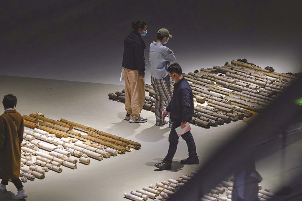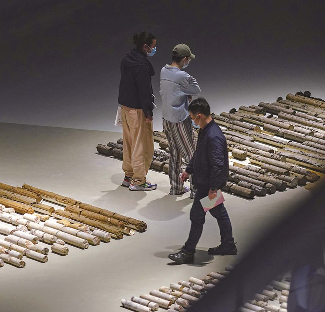 2021_BK:《沙的銀行或銀行的沙》在21年後再次在上海的UCCA新館的開館展上呈現,這次展覽位置離當年的上海美術館原址距離大概一公里,這座用沙堆砌的銀行好像用了21年的時間,平移來到蘇州河北岸。今年雙年展同期在上海當代藝術博物館還有一場題為「樹,樹」的展覽—和「水體」一樣的自然性話題,策展團隊成員費大為在展覽圖錄中談論黃永砅也頗具自然主義手法,他開玩笑的口吻說「他的腦袋好像被一陣旋風洗禮過,所有的長髮都朝向一個方向旋轉。他左邊的太陽穴被蓋住,右邊的則完全開放。」然後費大為繼續描述一個小個子中國人在法國的窘迫—「被巴黎藝術界的好奇逼入絕境……藝術家解釋的越認真,聽眾就越糊塗。當黃永砅的認真碰到巴黎人的好奇,其結果是非常不嚴肅的。」