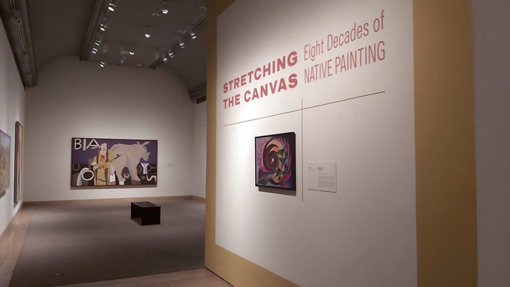 「展開畫布:原民繪畫80年」由館內策展人大衛.佩尼(David Penney)、安.麥克馬倫(Ann McMullen)、科曼切族(Comanche)的保羅.查特.史密斯 (Paul Chaat Smith)、瑞貝卡.特勞特曼(Rebecca Trautmann)以及現任波特蘭美術館(Portland Art Museum)納瓦荷族(Navajo)策展人凱斯琳.艾許.米爾比(Kathleen Ash-Milby)共同策展,展出1940年至今美國原住民繪畫藝術的發展,以五個主題,約莫以時序發展串連起的媒材藝術史。展覽之所以專注在繪畫發展,主因在於它不同於編籃、陶、雕刻等生活工藝多數處於生活傳承與自用範疇。「畫家」作為一種職業的判斷與認同,是個人主義式的作者的確認,與生活工藝產生有意識的區隔,而其技藝訓練與養成正是處於殖民現代性的協商地帶,亦即,學院的美術教育,也因此在這檔展覽裡,藝術家在(原住民專門)學院裡的美術訓練成為重要的論述主軸。然,同樣的在學校教育裡,支助學校的慈善單位、贊助人、藏家等等對於什麼是「原住民藝術」都持有不同的見解,藝術家在畫布上進行文化再現的同時,也面對著多方對於原民性需求的拉扯,對外與向內的原民性文化測量成為面對市場、教育體制尋求金援(Play Indian for Indian Advantage)、自身認同、創作追求不斷挪移的判準。