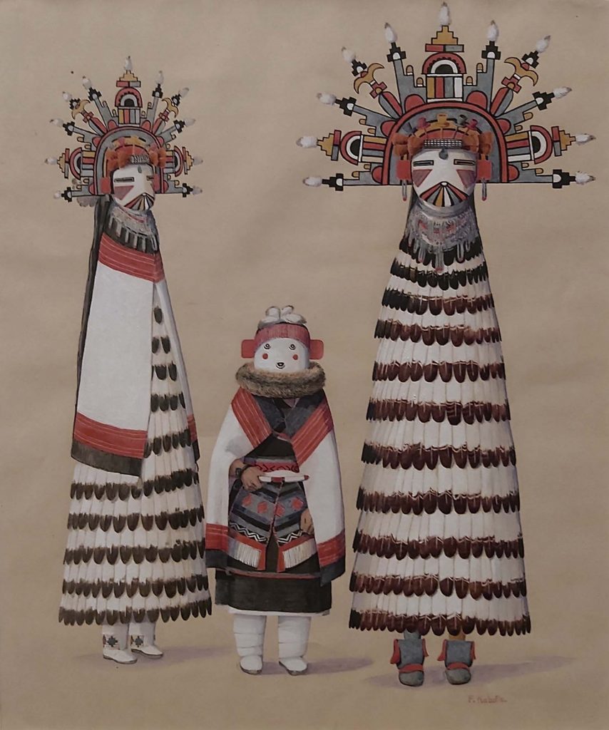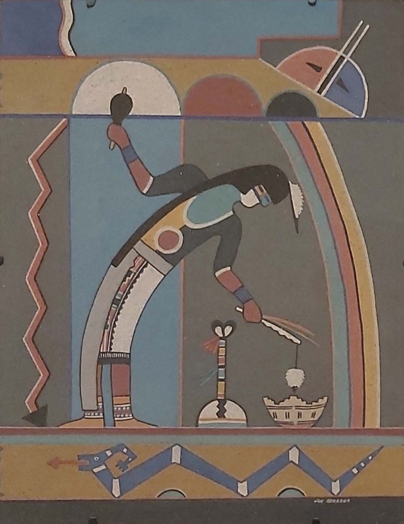 二次大戰後在美國興起的抽象主義,成為厭倦了平面的、樣式性由政府引導的原民風格的創作者一個革新的契機,在主題「奪回抽象性」(Reclaiming Abstract)探討的便是藝術家們認為美國原民傳統的圖紋便有抽象的本質,從陶壺、編籃與編織上的圖紋擷取的抽象形式便成為嶄新的藉以表達認同與文化的表現形式。現代主義與原民藝術與工藝的交集,不得不提到1941年在紐約現代藝術博物館(Museum of Modern Art,MoMA)舉辦「美國原住民藝術」(Indian Art of the United States)該展由佛雷德利.道格拉斯(Frederic H. Douglas)與德哈農科特(René d’ Harnoncourt)共同策劃,由原住民藝術與工藝委員會主辦,雜揉著「傳統與進步」共融的意圖,希望將原民工藝提升至美學欣賞層次。因此選在白立方空間的展示,讓熱愛展示設計,未來的第二任MoMA館長—德哈農科特進行規劃,結合著劇場式燈光、高低不一的展架,邀請弗雷德.卡博蒂(Fred Kabotie)由聖達菲印第安人學校畢業的知名霍皮(Hoppi)畫家重製大型壁畫,而在開幕時邀請納瓦荷族族人製作沙畫,近一步啟發也影響了傑克遜.波洛克(Jackson Pollok)創作方式,使得抽象表現主義與象徵主義有了一次原本應該相互拒斥的連結。因此,在二次戰後美國的現代藝術持續地宣稱受原始藝術(primitive art)啟發,在誤讀與浪漫化的想像中,共處於現代性的驅力裡,原住民藝術家也在現代性潮流裡尋找他們的語彙,如海倫.哈丁(Helen Hardin)、喬.艾雷拉 (Joe Hilario Herrera)及帕布莉塔.維拉德(Pablita Velarde)專注在傳統紋飾中擷取並開展抽象特性。