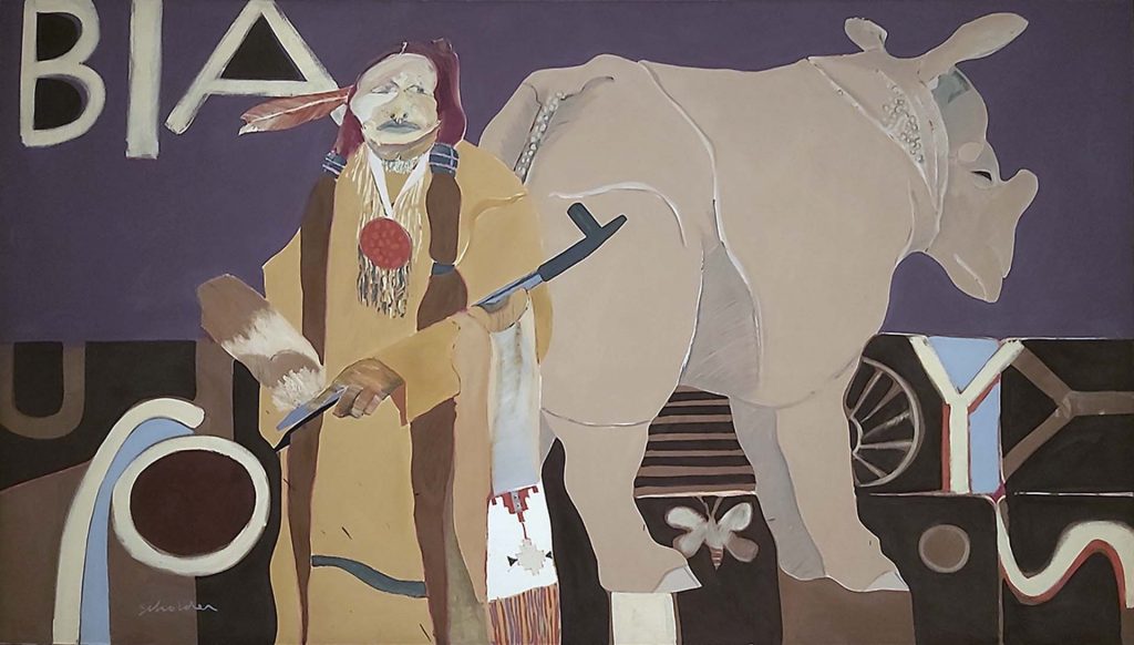 「印地安普普」(Indian Pop)主題圍繞在一所新的美術學院成立,1962年在新墨西哥州聖達菲成立的美國原住民藝術機構(Institute of American Indian Arts,IAIA),由原住民藝術與工藝委員會推動並有了洛克斐勒基金會(Rockefeller Foundation)的介入,除了因為對原來的保守的「工作室」系統不滿,對於近一步的高等教育需求也促使它的成立。樂於接受當代藝術語彙如普普藝術或現代抽象主義,弗里茨.夏爾德(Fritz Scholder)在IAIA教授具有普普風格的平面設計與繪畫,此種繪畫語境也影響了新一代的創作者,對抗過度浪漫化的原民意象,夏爾德擅長以反諷手法繪製當代美國原住民的生活處境,在《走向另一間酒吧》(Walking to the Next Bar,1974)他以大膽的顏色繪製滿身酒氣頭戴牛仔帽且步行狼嗆的男子,在《原住民與犀牛》(Indian and Rhinoceros,1968)一作他將原住民事務局(Bureau of Indian Affairs,BIA)喻作一隻背對著族人笨重的犀牛,這也呼應了美國蘇族哲學家與社運者,范恩德羅里亞(Vine Deloria Jr.) 經常提起的一則笑話:「如果你怕地震,應該去原住民事務局工作,因為沒有事情能動搖它。」在同一世代的藝術家,如哈里.夏爾德(Harry Fonseca) 則將他繼承來的邁杜文化(Maidu)裡郊狼的傳說,以擬人化充滿趣味感的造型呈現,作為自己替身的郊狼時而在舞池出現,時而穿著皮衣與同性伴侶倆倆相對,豐塞卡全然地擁抱都會生活與自己的酷兒特質。更年輕一代的藝術家、教育者美利堅.梅莉迪特(America Meredith) 也擅長將原住民藝術與普普風格結合,以幽默語彙探索社會與環境的議題,在《祝福:約翰.火.跛腳.鹿》(Benediction: John Fire Lame Deer,2005)一作便試圖承載拉科塔(Lakota)聖人的精神「走進世界才能更好的服務你的族人」以約翰.火.跛腳.鹿在經歷都市各種勞動與情感生活後,決定回到保留區以巫的身份服務族人。回應了梅莉迪特積極的參與在地社群,參與復振部族語言運動與文化傳承。