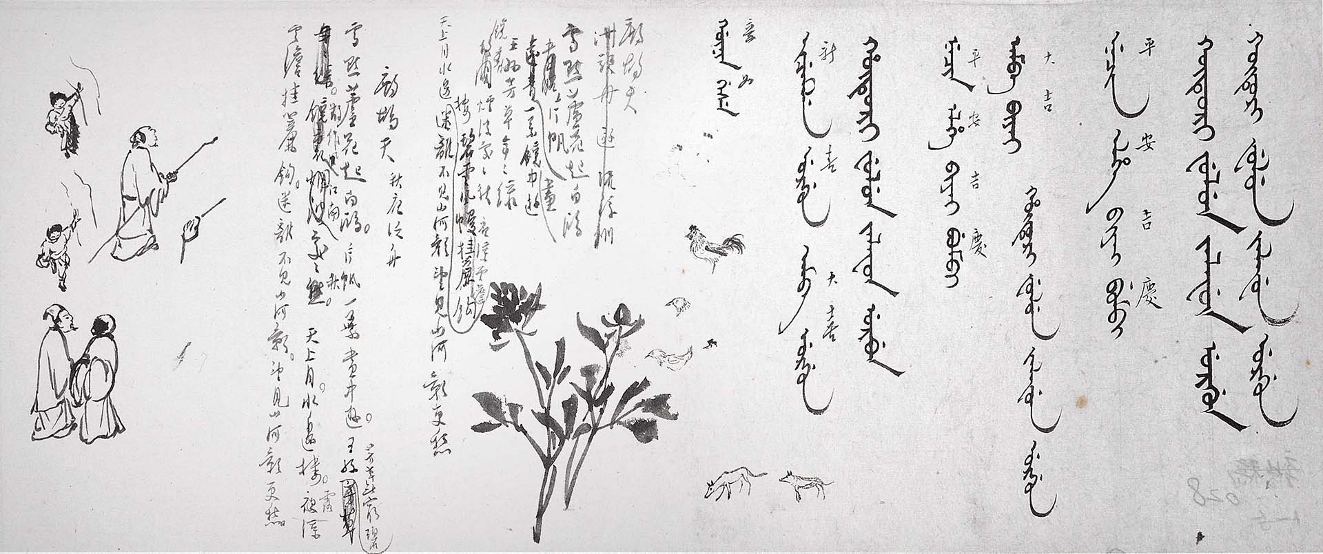 展中饒富意趣的圖稿,還有:《團花紋壽字圖稿》以水仙、荷花、牡丹、繡球花等花團錦簇組成壽字,寓意「百花賀壽」,然此稿線條用筆甚弱,花瓣複葉等未能清晰分出前後層次,應為溥師學生勾繪。《鍾馗課鬼圖》,繪鍾馗坐於大石,右手持書展閱,似感津津有味,一小鬼背對於旁,題詩「板蕩神州禍轉深,誰知將帥此中尋,緣何魑魅教經史,欲使稍存愛物心。」第一行清晰可見詩作修改痕跡,原應擬作「離亂中原烽火深」;加上《雜稿》中溥心畬對詞牌〈鷓鴣天〉的屢次修改,尤見其對字句斟酌的苦心造詣。多人敬佩溥心畬的詩才敏捷,援筆立就,猶如曹植七步成詩,便是天才也有用功之處。
