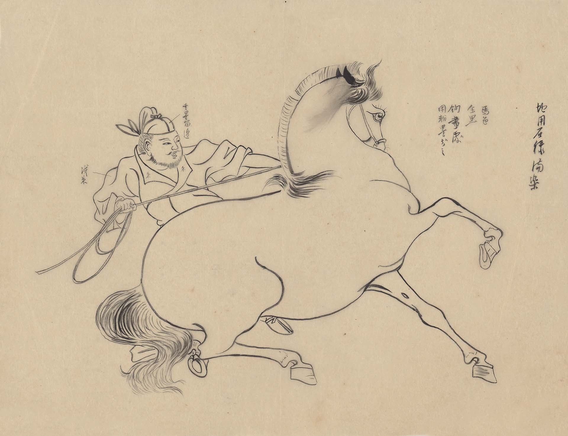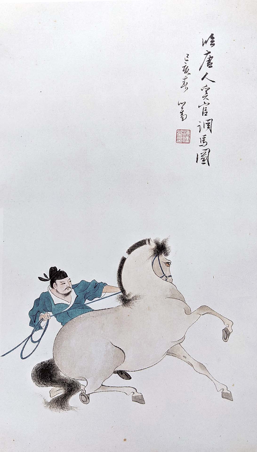 華岡博物館館長劉梅琴說明:「溥家圖稿中,無紀年亦無落款者居多,或有作品在故宮、圖稿在本館者。因此,常出現本館與故宮、史博之溥心畬作品多有題材相似甚至重複,或者畫作內容相同款識不同者等情況。」在此,列舉部分本展圖稿與博物館藏品可相參看之例。《調良圖稿》與臺北故宮溥心畬《臨唐人奚官調馬圖》相較,圖稿上標註用色與故宮作品不同,或為記錄所臨摹畫作之本色,另亦可見畫家不完全照稿之靈活設色。