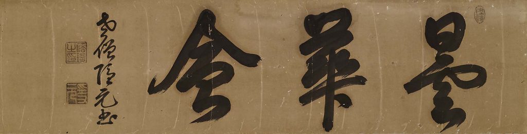 江戶幕府實施鎖國後,長崎成為外國人在日本唯一可居住的港口,唯宗教和商業尚受通融。1654年,福建黃檗山萬福寺住持隱元隆琦(1592-1673)東渡弘法,後在京都建立黃檗山萬福寺,促成日本「黃檗宗」形成,成為日本規模最大的禪宗教派之一,也將中國的書法、繪畫、建築、飲食文化傳入日本,深入江戶時代的社會。黃檗僧侶中,隱元禪師及其法嗣木庵性瑫(1611-1684)、即非如一(1616-1671)的墨蹟最受推崇,稱為「黃檗三筆」。據說隱元隆琦善寫大字,《「曇華會」橫披》可為印證,「曇華會」每個字約一尺,尺寸相當少見,中鋒行筆,圓勁流暢。此作原收藏在名古屋附近古寺,由於寺廟改建售出,由清大講座教授楊儒賓在古董店收得。