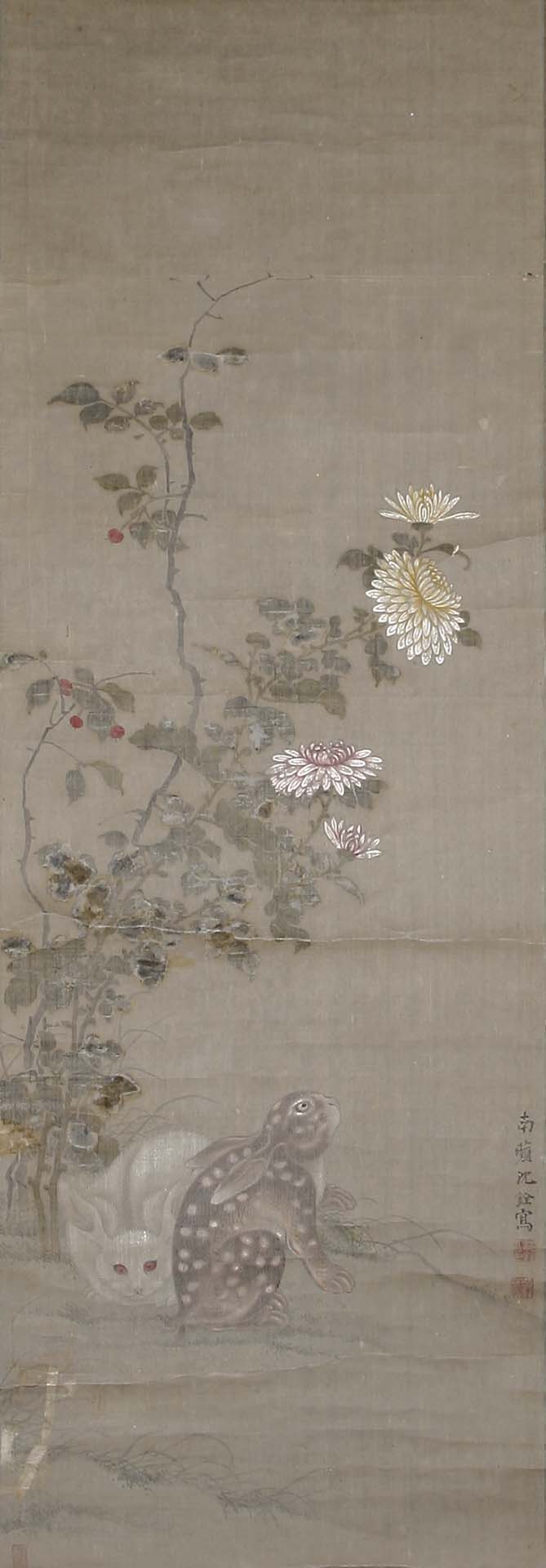 在嚴格的鎖國政策下,日本人民的國際視野受到框線,在東海往來的畫師、商人成了他們接觸中國文化的窗口。沈南蘋(1682-1762),原名沈銓,浙江德清人,擅長花鳥走獸,其畫風一方面模仿北宋以來的古法,一方面帶有西洋畫法的影響,描繪細緻、用色濃厚。沈南蘋在中國雖不是知名畫家,在日本畫壇卻占有一席之地,被譽為「舶來畫家第一人」。沈南蘋僑居長崎約1年10個月,許多日本畫人聚集至長崎學習南蘋畫風,形成「南蘋畫派」,對江戶中期畫壇有深遠影響。此次展出的《菊花雙兔圖》,款識「南蘋沈詮寫」,菊花賦色厚重,雙兔毫毛濃密,唯筆力稍弱,可能為南蘋畫派之作。
