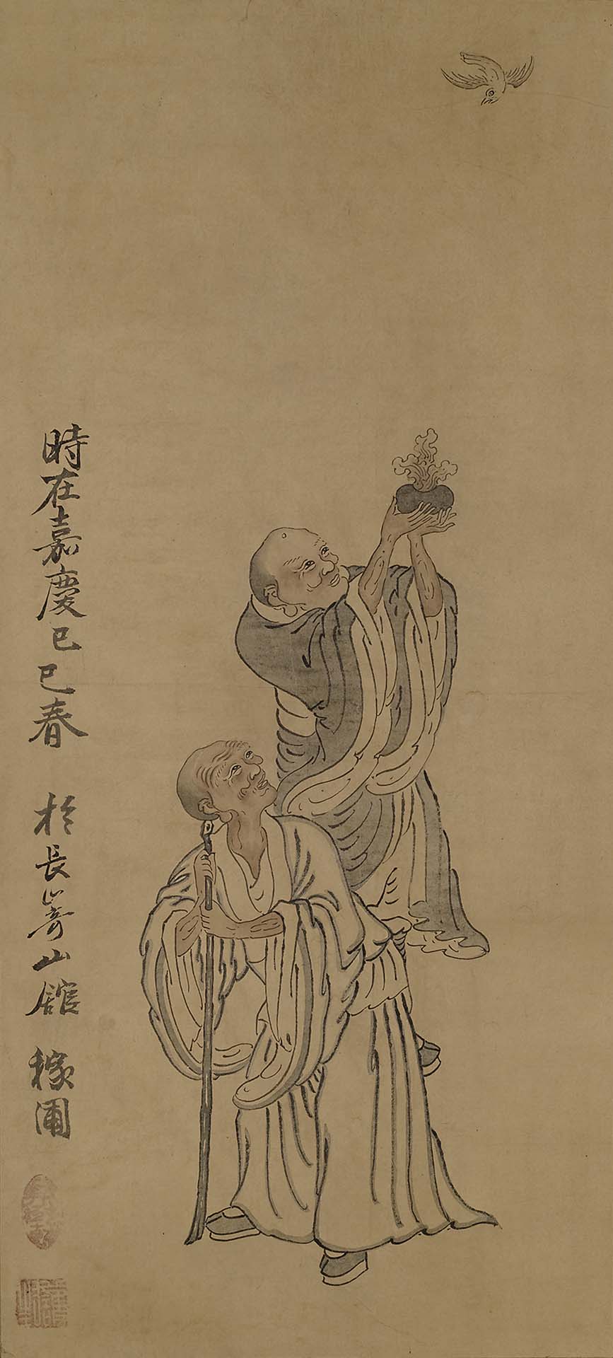 江戶晚期,持續有清人在中國與長崎往返,將中國畫風帶入日本,江稼圃便是其中之一。江稼圃,名泰交,字大來,浙江省臨安縣人,善繪山水與蘭草,與伊孚九、張秋谷、費晴湖並稱「渡日四大家」。江稼圃傳世之作多為山水、蘭竹,本次展出的《羅漢圖》為少見的人物畫,繪舉缽羅漢與另一位拄杖羅漢,筆觸輕鬆,略施彩色,落款「時在嘉慶己巳春於長崎山館」,明確指出此畫作於長崎,非常難得。