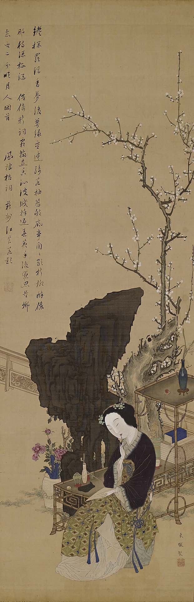 江稼圃之弟江芸閣同為赴日清人,詩、書、畫皆能,與賴山陽、田能村竹、大槻磐溪等著名漢學家均有交遊。他所題跋的《唐美人圖並贊》,其畫者東曨的身分待考,由江芸閣題詞可知美人夜夢梅花而起,欲起筆書寫,卻吮著筆若有所思。美人衣著華麗,桌上硯台、香具、茶具、書籍俱備,一旁梅花、水仙暗香,襯托女子的優雅賢淑。有趣的是,此圖一方面仿明清仕女畫風格,女子卻有鳳眼與挺鼻,面白若雪,頗似浮世繪美人。據清代《吾妻鏡補》,江芸閣著有十餘首竹枝詞歌詠長崎名妓,詞風「麗情豔態,宛然溢於紙表」,芸閣流風逸韻、長崎名妓風華,此圖可見一二。