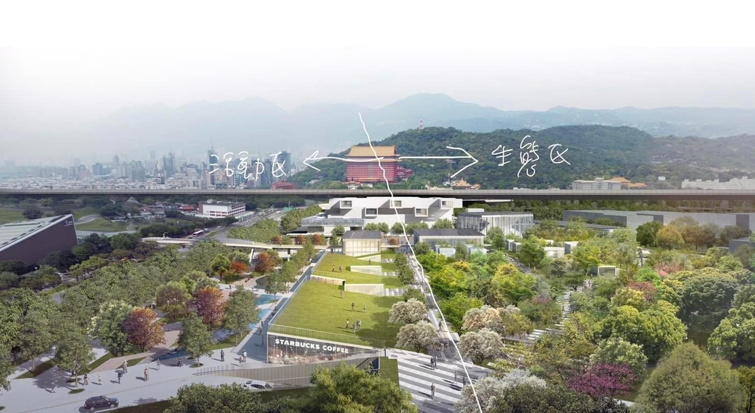 郭英釗團隊對北美館園區的地點,以森林公園為基準,劍潭山與圓山飯店的雙軸線與該區交會,扣除鄰近的4項保留區域,即北邊的林靖娟老師紀念水池區、西南側的王大閎建築劇場,相鄰微偏南的人行陸橋,東側則是共融遊樂區(inclusive playground)。剩下的,再切分三,最靠近中山北路側的是錯落的「都市林蔭 urban tree shade」,偏東側,是茂盛蓊鬱的「生態林帶 ecological forest belt」,中間長條狀是「生活林帶 living forest belt」,腰間被切走一個三角形,納入東側「生態林帶」。生活林帶就是這回北美館擴建案,地下化開發,再以覆土重現公園景觀。