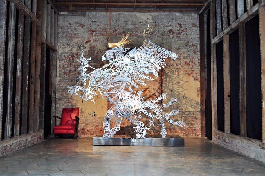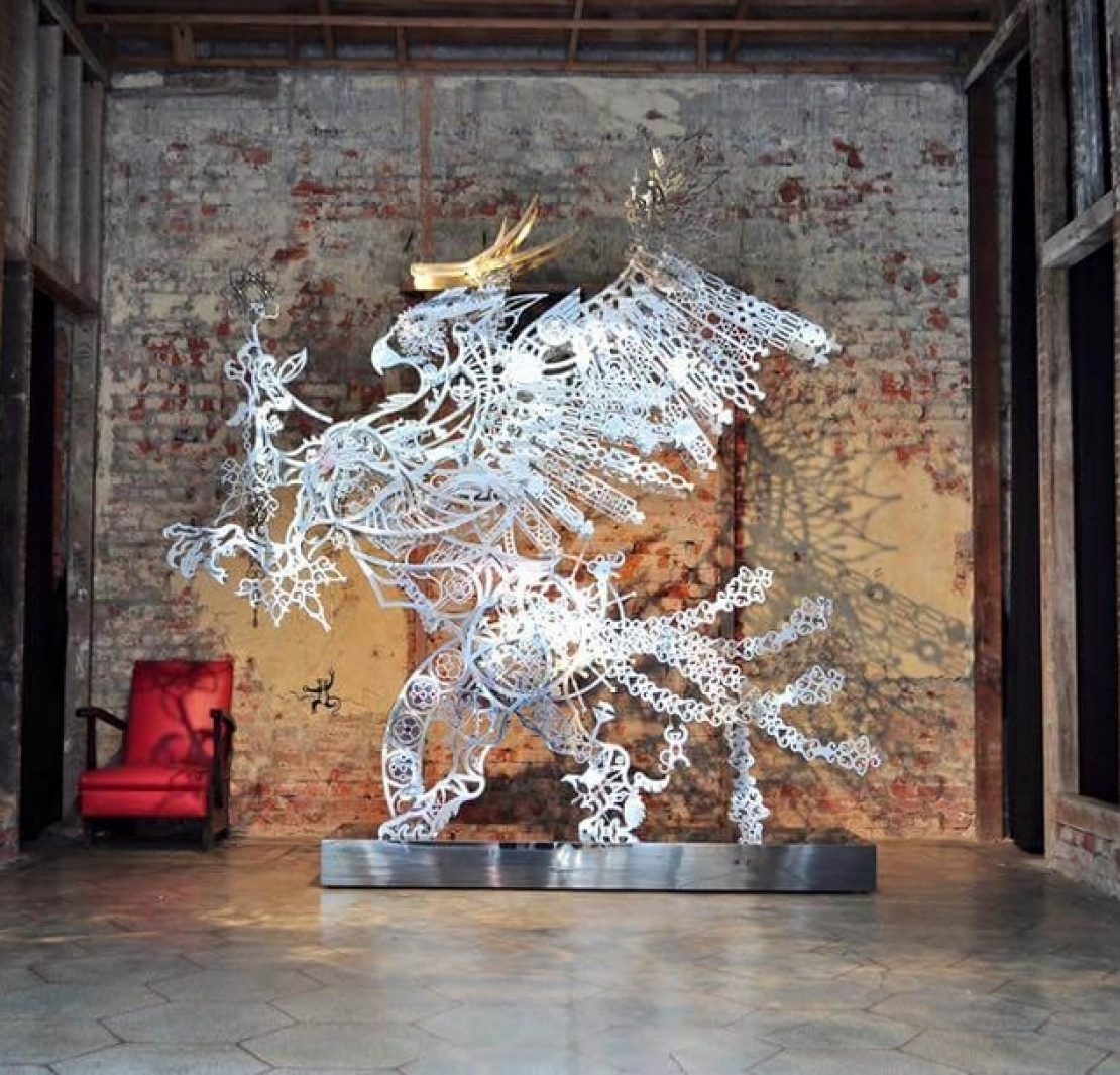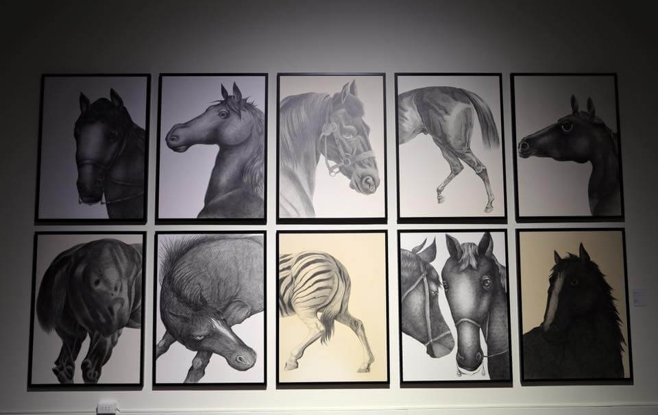 海舞展廳則進一步展現藝術家對於理想原型的追求,神話中的想像動物,錯落於展間,繁複華麗的層疊,鋪陳了席時斌的記憶、想像與現實生活之間,時而重疊、時而錯置、時而相互拆解的不同狀態。展廳環繞著《藍圖》及《馬》素描,直譯理想原型,也忠實呈現席時斌創作過程。