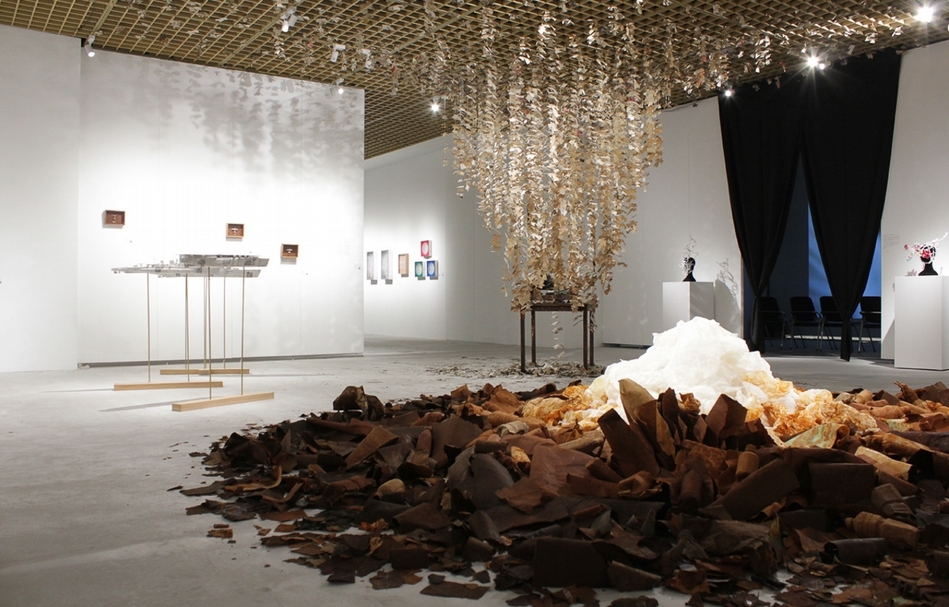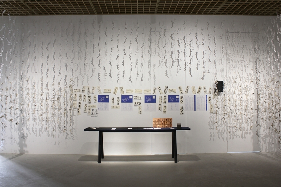 於展覽入口處左手邊的作品是和紙藝術家伊藤咲穂(Sakuho Ito)的裝置作品「御神籤」,御神籤在日本民俗中屬於日本神社裡用漢字撰寫的「神之預言」,是用來向參拜者傳遞反映著未來的訊息,但伊藤咲穂的「御神籤」,是由藝術家親手抄出來的空白和紙,籤詩的預言內容開放給現場參與的民眾自由撰寫祝福的話語,傳遞給下一位參觀者,具有集合眾人之力完成一件事物的日本祭典精神。