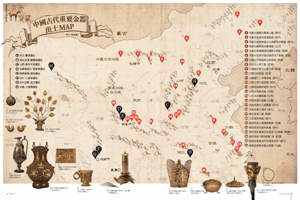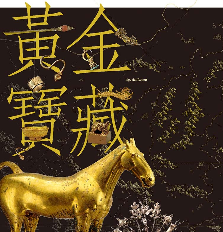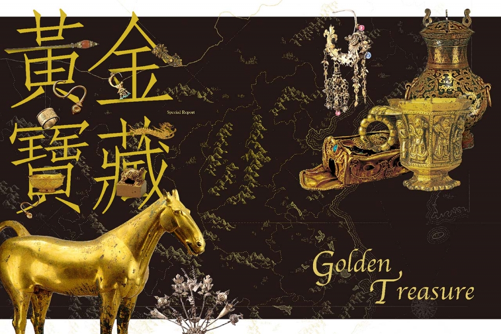 中國古代黃金無論作為日用器、飾品、宗教用器或者貨幣,都是上層階級使用的奢侈品。本專題「黃金寶藏」,從一張展開的黃金藏寶圖開始,介紹中國黃金藝術文化的歷史脈絡、五大黃金工藝製作技法、選介七件明星級黃金故事,以及臺灣傳統漢人金銀首飾工藝。黃金的歲月從公元前金器的登場,走過內蒙古草原民族皇家墓葬的財富,登峰於長安古都埋藏供奉的帝國輝煌,一路緩步到臺灣民生常見的日用金飾,耀眼炫目的金色光芒自「金」豔於世那天起,不曾黯淡。