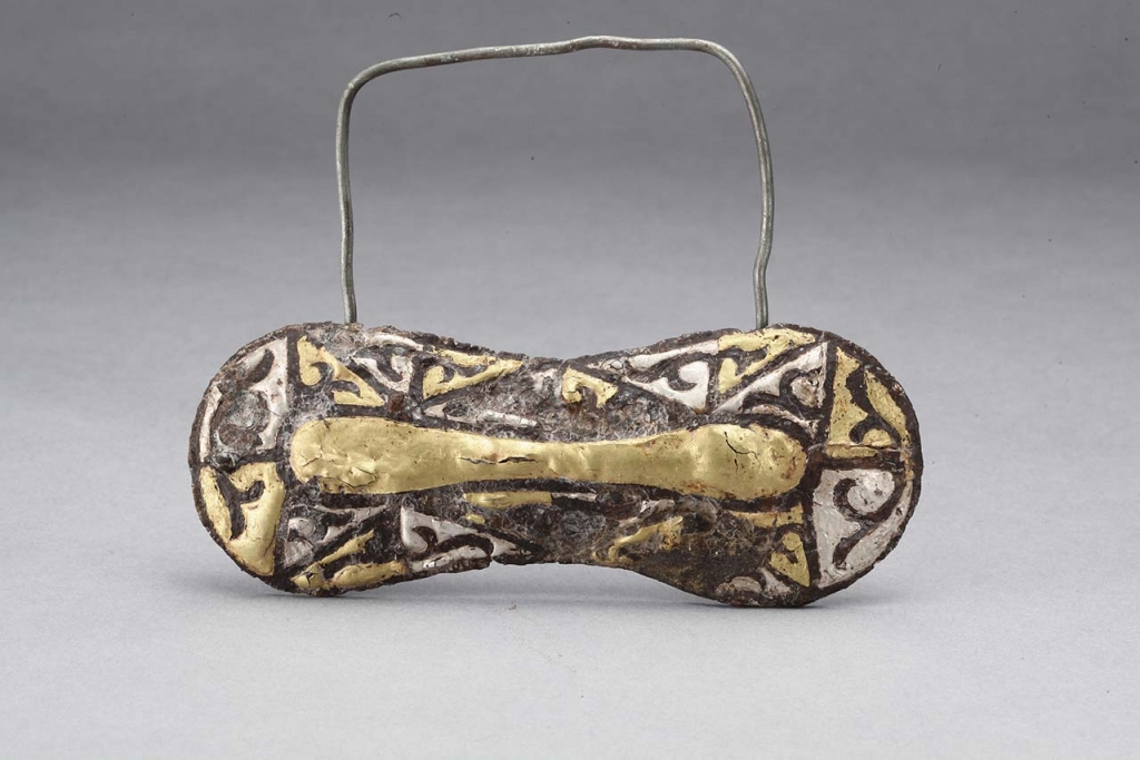 燕下都辛頭莊30號墓的金人頭形飾、西溝畔2號墓金帶扣與銀節約、徐州獅子山楚王陵的一幅〈金帶扣〉(圖6)背面都鏨刻篆書銘文,標明重量或製作者,應是秦、趙等少府工匠專為胡人貴族打造。(註2)西安北郊康村戰國晚期鑄工墓出土的斯基泰動物紋牌飾模具,進一步證明秦人為草原遊牧民族生產金屬製品的事實。(註3)戰國晚期至漢代掐絲、珠化及彩石鑲嵌的流行(圖7),或與來自巴克特里亞以「黃金之丘」為代表的河中地區的影響有關,此遺址曾出土漢代銅鏡;往北哈薩克阿拉木圖Kargaly遺址出土的1世紀下半葉金冠飾,其上翼馬羽人被認為是受漢代藝術所影響(註4),草原絲路互動交流於此可見一斑。戰漢時期與西北諸民族的交涉促進了藝術風格的借鏡。