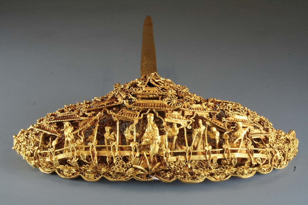 明代金器多見於定陵萬曆帝后墓以及各地藩王墓。明代有著非常明確的用金制度,禮制用品多由內府機構(如御用監、內官監、銀作局)或藩王府承(丞)奉司製作,以供內廷、外藩以及高級官員及命婦使用,所以在品類、形制上體現出一定的規制。(註9)金器多亭臺樓閣人物故事裝飾及紅藍寶石鑲嵌。插戴於髻上的多達數10、20餘枚的各式簪釵(圖24),構成皇室、命婦華麗的首飾,奢華超越前代。金簪釵以金絲或窄金片盤卷、焊接出立體、鏤空造型,甚至配合珠化點綴,使得器型玲瓏剔透,又能減輕飾品重量。中晚明江南地區官宦之家更流行小件鑲嵌金飾,金質器皿少見。金花銀器不再流行。