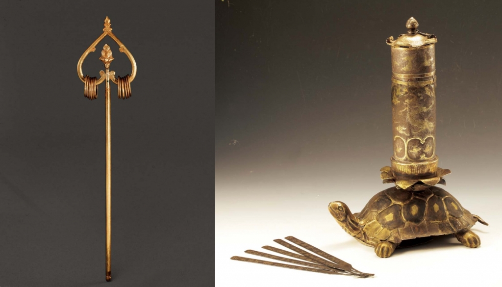圖16 唐〈銀鎏金龜負酒令筒、酒令籌〉,江蘇省鎮江市丁卯橋窖藏出土,鎮江博物館藏。(右)