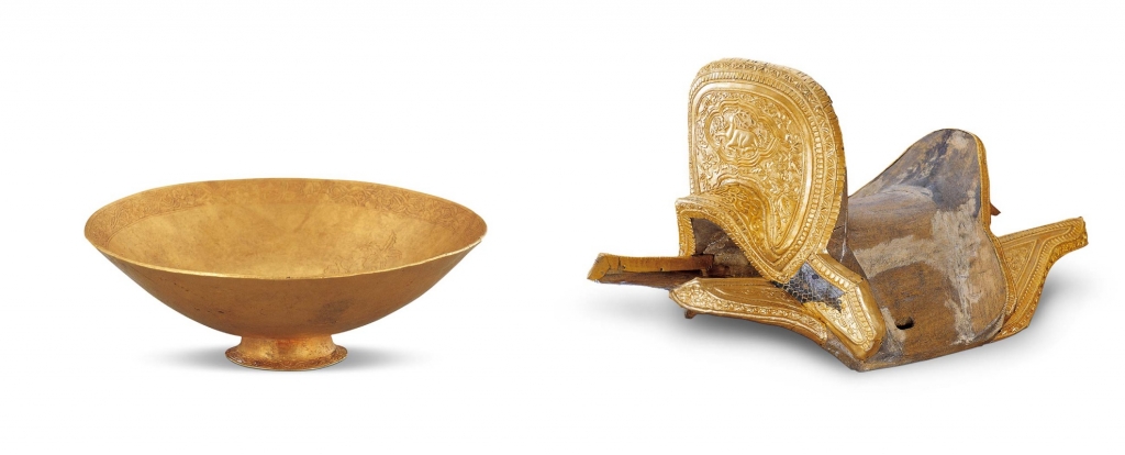 中原地區以甘肅天水張家川馬家戰國晚期戎人墓、河南洛陽金村周天子墓、河北平山戰國晚期中山王厝墓(鮮虞)及辛頭莊燕人墓、以及湖北隨縣戰國早期曾侯乙墓為代表。馬家、辛頭莊出土之隨葬品,顯示北方農牧交錯地帶民族的用金特色。兩墓均出土青銅禮器。馬家黃金服飾,如項圈、手鐲、腰帶、帶鉤之奢華,與北方草原民族幾無二致。以金銀箔片盛裝的車馬器(圖4)和武器,更是絕無僅有。辛頭莊出土之金飾數量雖不及馬家,但對羊紋飾片、牌飾及刀劍或劍鞘金飾,無不顯示斯基泰藝術元素。