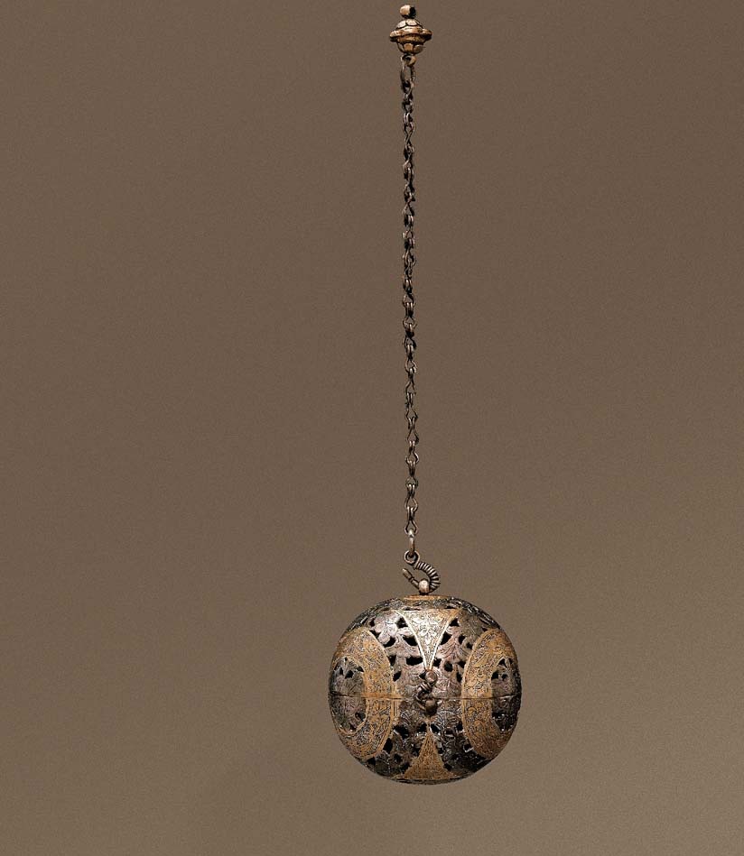 如果說自青銅時代開始,歷戰漢、初唐,中國古代金銀器主要吸收來自域外的影響和工藝,北朝多域外成品輸入的話,那麼,從唐代開始以瓷器貿易為主導的海上絲路的繁榮,開啟了之後近千年中華文明對域外的影響。唐、宋金銀器的外銷,見於黑石號、南海一號出水,那些鏨刻作坊名號的金質容器、項鍊使我們可以一睹出口金銀器的風貌。唐代設計精巧的銀鎏金鏤空香囊(圖26),盛唐時流傳東瀛,蒙元時期西傳伊斯蘭世界,啟發馬穆魯克王朝(1250-1517)工匠精妙仿製黃銅香球。(註10)由是觀之,黃金藝術實乃歷時3000餘年古代中西文化交流的縮影。