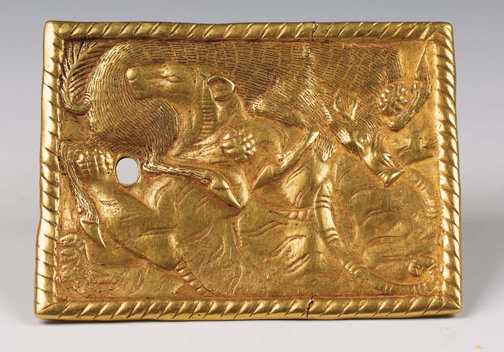 進入戰國,最重要的金器均見於晚期墓葬。北方以戰國晚期至西漢早期的新疆哈密巴里坤西溝遺址1號墓,以及內蒙古杭錦旗阿魯柴登、準噶爾旗西溝畔兩處匈奴墓最為引人矚目。(註1)金飾是主要隨葬品,巴里坤西溝1號墓雖然被盜,出土仍達133件之多;阿魯柴登墓有218件、4000餘克;西溝畔墓出土金器數量亦超過銀、銅器。出土金飾多錘鍱、模沖成型,少量模鑄,以首飾、服飾、劍飾居多,流行馬、虎、鹿、狼、牛、鷹、神獸或獸搏造型或圖案(圖3),熟練運用金珠或金粟裝點器表,顯示受歐亞草原斯基泰黃金藝術的強烈影響。從考古發掘看,公元前7世紀前後興起的斯基泰黃金藝術首先在新疆留下痕跡,繼而東傳影響中國北方地區。東塔勒德墓是目前中國境內最早集中出土斯基泰風格黃金飾品的遺址。斯基泰藝術影響之餘韻一直延續至漢代。