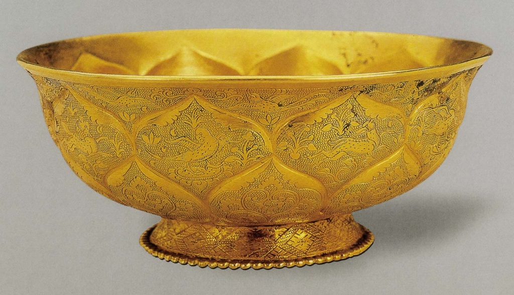 唐〈鴛鴦蓮瓣紋金碗〉,高5.5公分,口徑13.5公分,何家村窖藏出土,陝西歷史博物館藏。