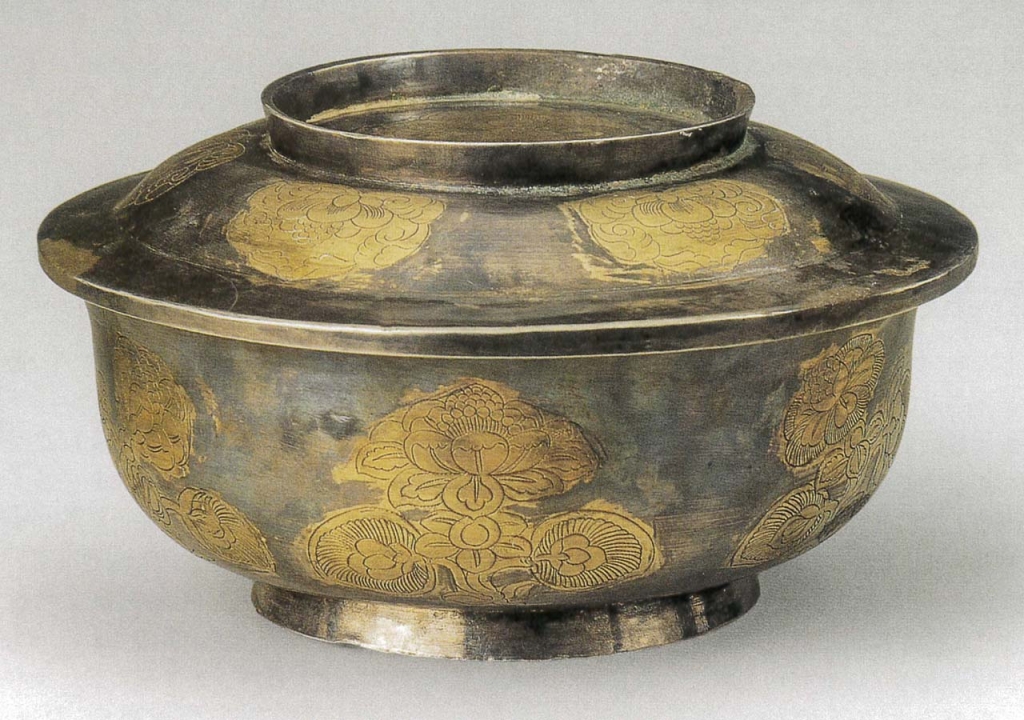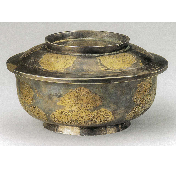 唐〈鎏金折枝花紋銀蓋碗〉,高11.9公分,口徑21.8公分,何家村窖藏出土,陝西歷史博物館藏。