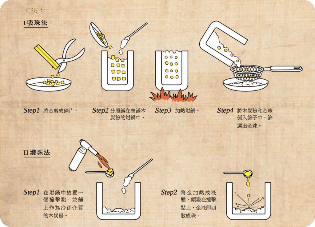 珠化乃至所有的細金技術,最難的部分即「焊接」。金的熔點約攝氏1064度,焊接細金方法有二,一是「直接焊接法」,加熱使金珠與器物基體部分表面達到熔融狀態,待冷卻後即焊合。此方法對於溫度掌控要求極高,溫度太低無法焊固,溫度太高又會使金器熔解。二是「焊料熔焊法」,採「燒結」原理,金屬在粉末狀態下熔點僅為原本的65-80%,故金粉理論上可直接作為焊料使用。此外焊料配方還有金銅合金、銅鹽(孔雀石粉)等。