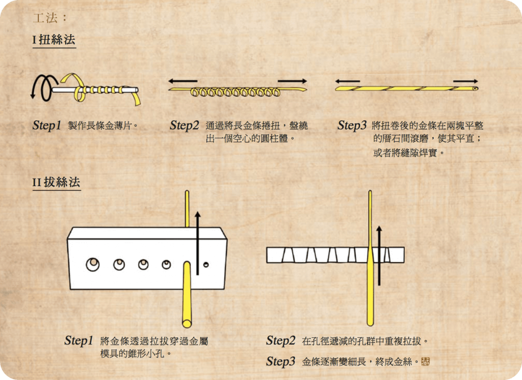 黃金因優異的延展性,適宜被製成絲。古代製作金屬絲主要有空心的「扭絲法」和實心的「拔絲法」。金絲製備後,可掐捏成各種形狀焊接到器物表面,可編織成索鏈、網,還可推纍出平面或立體造型後焊接固定,分別稱為掐絲、編絲和纍絲。11世紀後,整個歐亞大陸的扭絲法逐漸被拔絲法取代,宋代之後扭絲法不再流行。