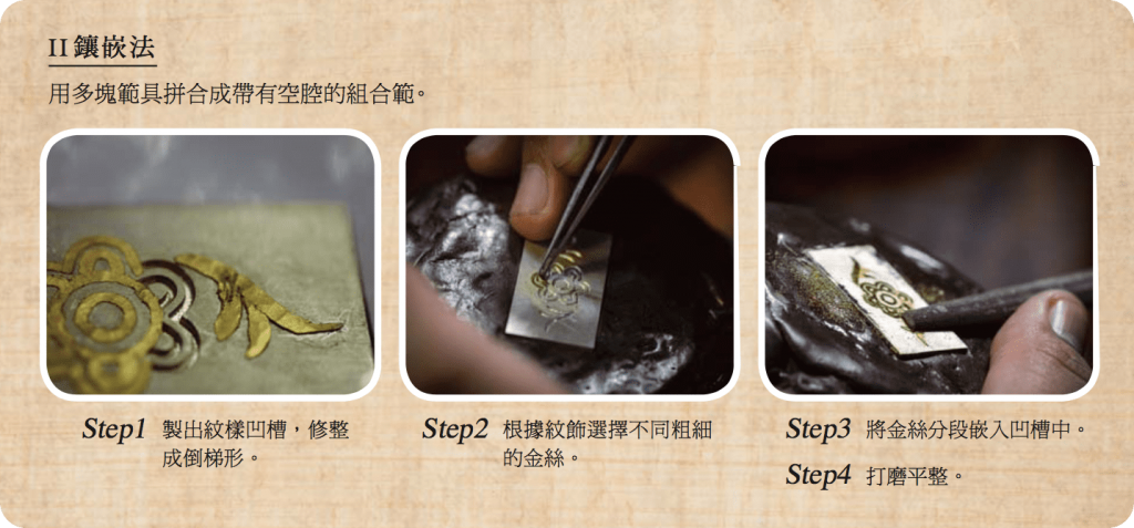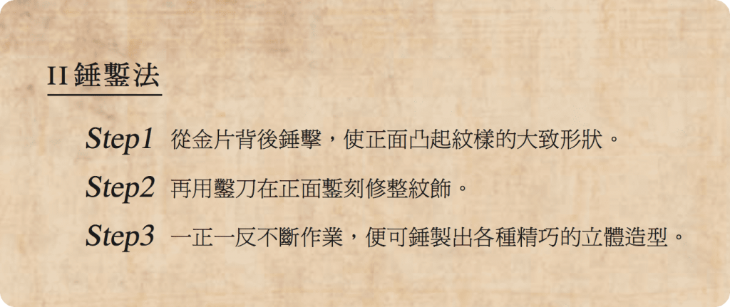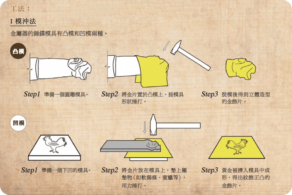 黃金質軟,延展性強,容易錘鍛成各種形狀。錘鍱與鏨刻是最基本的黃金工藝。「錘」,即是錘打、鍛打。「鍱」,是將金屬錘打成薄片。錘鍱成器後再加刻紋飾,稱之為「鏨刻」。