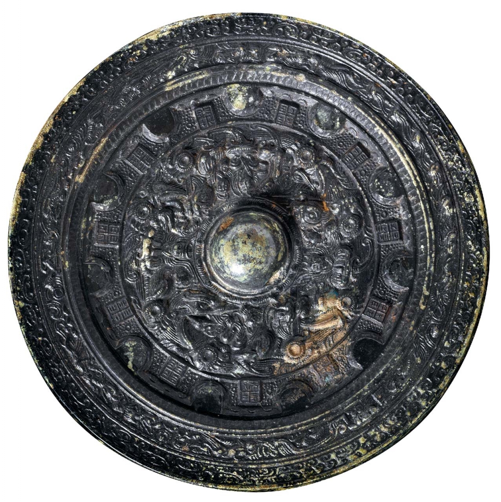 中國文化裡,關於天地自然的概念,一直被視為宇宙洪荒力量的具體顯現。特別在道家或儒家學說裡,針對山水的討論更是從未停止。藝術表現上,無論是神話宗教的仙境山水,或是文人雅士的風景心境,皆表現出多元豐富的樣貌。展場中〈西王母與東王公銅鏡〉(圖1),為東漢時期作品。鏡內可見西王母頭戴髮飾與東王公頂置冠冕,還有騎龍仙人與伯牙撫琴等人物圖案安置四方。藉由擬人化手法,不只尋求長生不老,更期待富足生活,並聯繫空間各處方位,強調彼此的和諧共存。