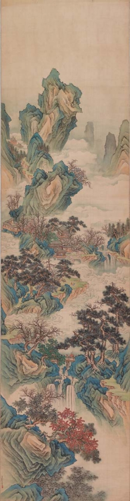 本區另一件精美細膩的〈仙山樓閣〉畫軸(圖3),作者永瑢(1743-1790)是乾隆(1711-1799)第六子,封質莊親王,自號九思主人,善於詩文書畫,山水作品尤其出名。圖中山石層疊堆砌蔓延而上,殿閣樓亭錯落其間,點景人物或持杖而行,或聽松觀雲。特別是縱貫全幅呈現S型的飄渺雲霧,以及溫和雅緻的小青綠設色,更顯仙境般的綺麗曼妙。此類狹長條幅形制、堆疊構圖布局和清淡色調敷染等特色,無不延續明代文徵明(1470-1559)一派的風格。