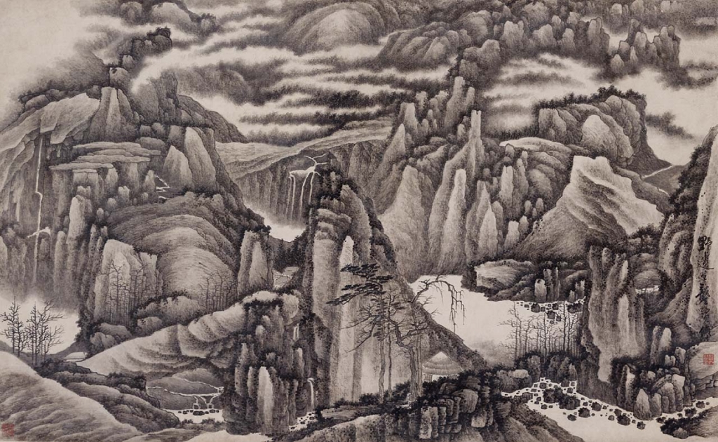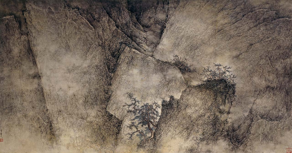 出生於上海、活躍於美國的畫家李華弌(1948-),曾於1990年代數次攀登黃山,深受當地奇峰煙雲的絕勝風景感動。之後他便以山川勝地為靈感,創作一系列如夢如幻的水墨作品而成名藝壇。本次展出的〈山水〉(圖11)繪製於2009年,李氏以北宋巨碑山水畫傳統為宗,融和西方繪畫抽象表現主義的精神,展現既鉅細靡遺又幻化迷離的心象山水。透過不斷親身探訪名山大川,藝術家得以領悟宇宙自然的氣韻真理,並以筆墨抒發於紙上,體現個人感通天地的胸中丘壑。