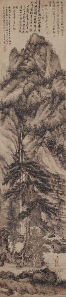 詩、書、畫三絕是中國藝術的精粹所在,本區探討詩文如何成為景觀再現的一部分,並加強觀者的視覺經驗。另外也探索圖繪如何表現文字意涵與個人情緒,以及結合上述兩者的書法創作面向。明天順四年(1461)時年35歲的沈周,為友人碧天上人繪製山水掛軸(圖6),題詞曰:「石梁苔雨歇,平跨古松陰。靜了千翻具,閒迂一錫金。澗聲秋滌耳,山色晚經心。不待沃州去,幽期從此尋。」畫家以仿王蒙(1308-1385)筆法,描繪叢山峻嶺,一名僧侶身著紅袍,戴笠拄杖立於石樑上,抬頭觀望眼前的高聳巨松。30年後沈周又賦詩寫道:「三十年前寫此山,山房重看石仍頑。山翁那得長如此,當被青山笑老顏。此圖距今已三十一年,余亦六十五齡。頭童齒齒,不復如故吾矣。」表達友誼長存與時光流逝之嘆。