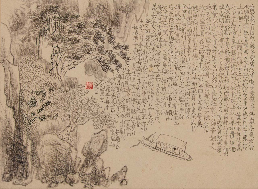 展覽中一套清代金農(1687-1763)所繪冊頁,也是引起觀眾討論的焦點之一,畫題包括東晉陶淵明(365-427)〈歸去來辭〉、唐代白居易(772-846)〈琵琶行〉、宋代歐陽修(1007-1072)〈醉翁亭記〉與明代宋濂(1310-1381)〈閱江樓記〉等歷代知名文學作品。此處展示的畫頁(圖7)以宋代蘇軾(1037-1101)〈赤壁賦〉為主題,畫家以其特有如金錯刀的渴筆八分書法,於畫幅右側全文抄錄撰寫蘇文。左方則圖繪文人雅士泛舟臨遊赤壁之景。整體布局大膽新穎,圖文雖填滿畫面,但不顯壅塞侷促。且筆墨色調質樸,流露雅緻古意,充分展示其個人對於詩、書、畫藝之天賦異稟。