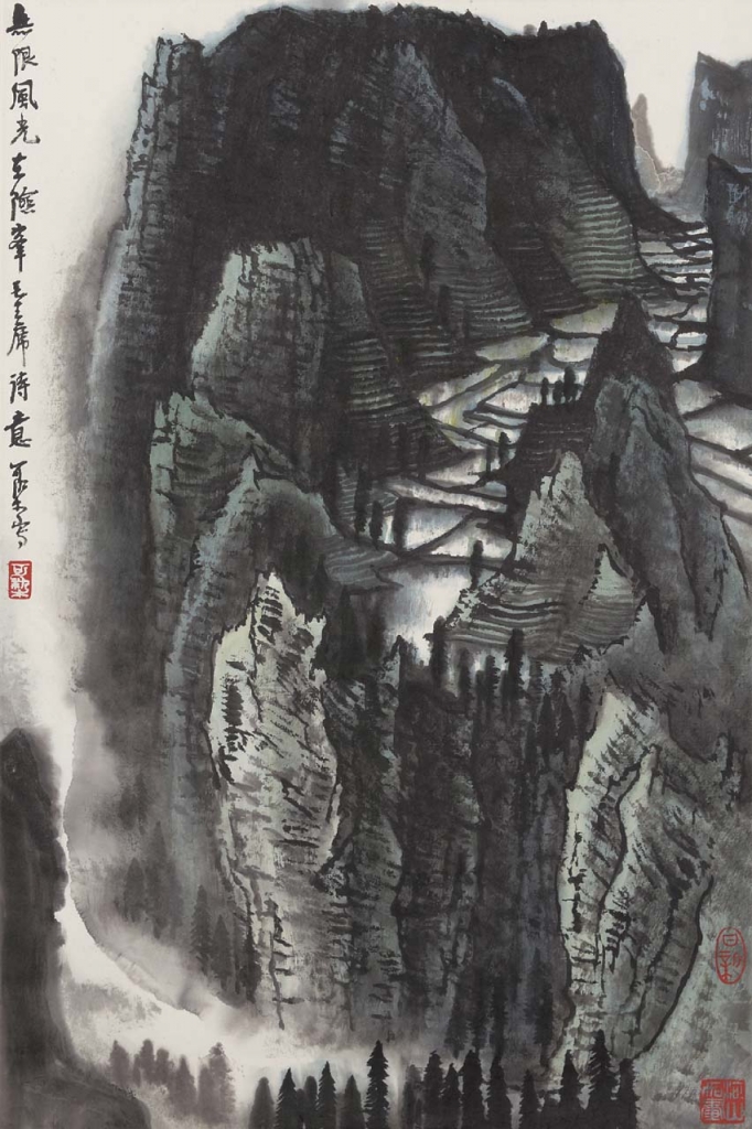 到了近現代,中國畫家仍然親力實踐三絕精神,李可染(1907-1989)〈無限風光在險峰〉(圖8)可為代表。本幅約完成於1961年,主題取自毛澤東(1893-1976)詩作:「暮色蒼茫看勁松,亂雲飛渡仍從容;天生一個仙人洞,無限風光在險峰。」李氏從小學習傳統山水畫,入學上海美專與杭州國立藝專後,始接觸古代水墨畫的革新議題。1960年代之際,他把古代「積墨法」與自創「積色法」結合,開創個人風格。此畫以濃墨線條為基,描繪山林田野輪廓,後再以青綠敷染設色。通篇墨氣淋漓,一氣呵成。