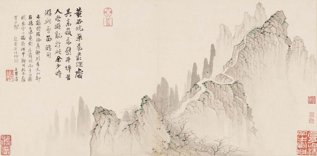 明清時期逐漸興起旅遊風尚,尤其中產階級特別鍾愛名勝古蹟與史蹟景點,成為日常生活中不可或缺的休閒活動。許多藝術家也以此機會,創作大量精彩作品,留作紀念回味,更邀觀眾共襄盛舉。清代梅清(1624-1697)《宣城勝景》圖冊,共24頁,約製作於1679年至1680年間,主要描繪其家鄉安徽宣城的名山勝地。此處呈現「黃谷坑」一景(圖9),根據畫家自述,本地位於「華陽最深處,其高嶺為熨斗坪」。梅清採創新視點與出奇構圖,以對角橫切的方式,捕捉山稜的崎嶇陡峭與步道的蜿蜒曲折。此外散落峰頂的青綠苔點,在遼闊無際的空間中,顯露盎然生氣。畫幅中央站立道上的人物,彷彿邀請觀眾加入這趟美景旅程。
