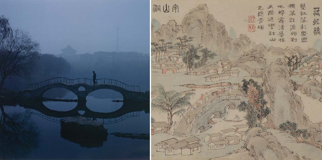 回到當代社會中,策展團隊以海波(1962-)〈藍橋〉(圖10左)作為呼應。海波出生於吉林長春,曾求學吉林藝術學院與中央美術學院。擅長以攝影為創作媒介,探討時光流逝與人、事、物的變化歷程。作品中藝術家以詩意朦朧手法捕捉行人過橋的景象,將平淡的當下瞬間,轉化成不凡的永恆久遠。海波常把極易被忽略的鄉野景觀、人物,凝聚呈現出某種特殊的懷古歷史感,帶給觀者一種溫情觸動。若與上述蕭雲從作品相較,兩者一靜一動,一簡一繁,反映創作表現上的明顯對比。