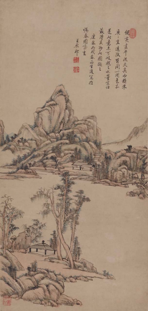 中國藝術裡的「崇古」傳統,向來是歷代創作者思考的主題之一。經由向往昔大師的臨摹學習與取法借鏡,加上自身的領悟天分與努力不懈,畫家們從中激發出無盡的創作能量與個人嶄新的詮釋。以清代王原祁(1642-1715)〈仿古山水〉(圖12)為例,畫上題跋表明他是以元代黃公望(1269-1354)、倪瓚(1301-1374)與明代董其昌(1555-1636)為師法對象,取其各自筆墨長處與風格特點,最後展示自己吸收前朝諸大師的傑出畫藝。圖中用筆細膩,敷色雅緻,皴法苔點合宜到位,構圖採一河兩岸形式,通篇古意盎然而極富真趣。