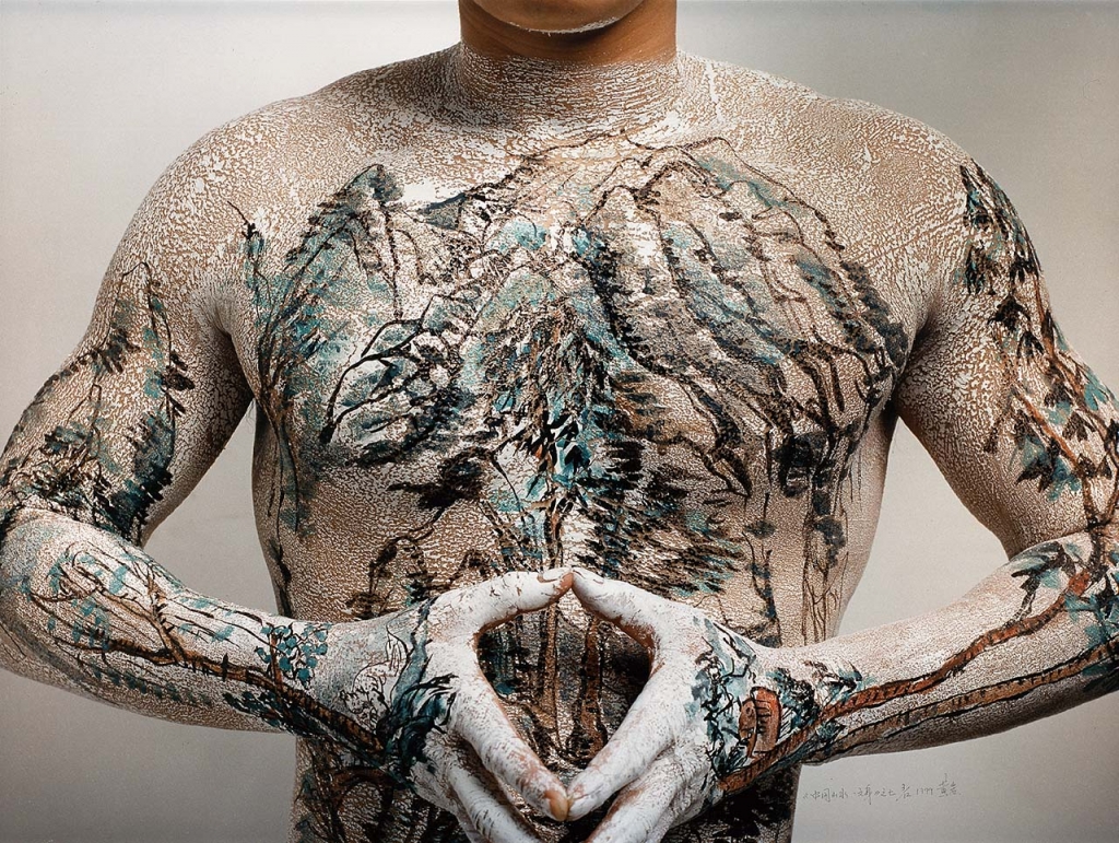 從小鍾情於山水的當代藝術家黃岩(1966-),吉林人,長春師範學院畢業。除了以紙張為畫底,1998年至1999年間,他以水墨繪製於身體上,試圖把傳統山水畫、行為藝術與攝影等眾媒材相互結合,創造出「中國山水─紋身」系列作品(圖13)。以肉身為畫布,山水為主題,黃岩想要探討人與自然的對話和互動。不同的肢體擺動,也會組成相異變化的山水構圖,提供觀者一種流動性的想像空間,呼應中國古典繪畫透視裡的散點移動特色。與上述王原祁〈仿古山水〉對應看來,可發現彼此間存在許多藝術共性。