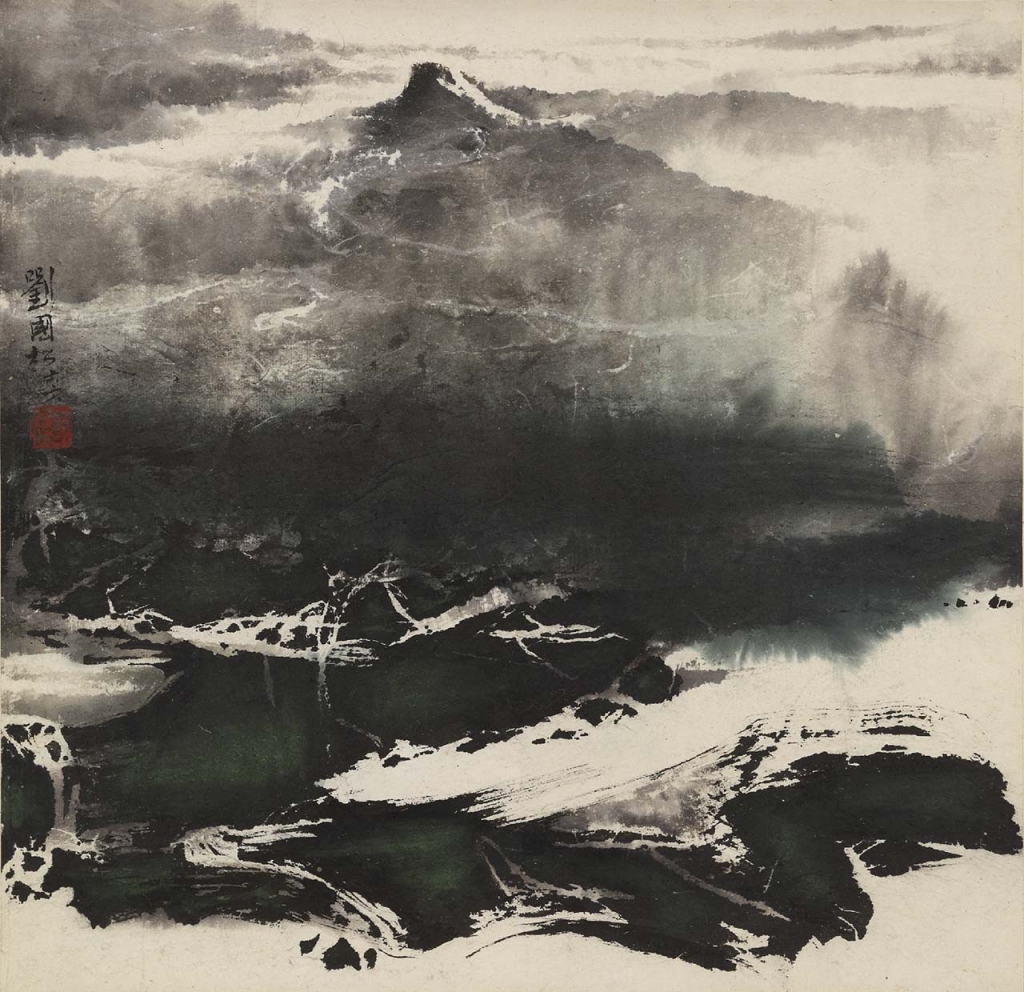 另一個以實驗創新技法注入水墨藝術的著名臺灣畫家劉國松(1932-),1967年完成〈雪景〉(圖14),師法古代畫師的簡約、飛白及渲染等筆墨傳統,再加入當時西方抽象藝術的概念精髓,創造令人驚豔的山水新風格。畫中他以變化多端的靈活視角捕捉山川景物,且用快速大膽的筆觸來增添磅礡氣勢。此外朦朧暈染的水氣與注重細節的表現,更顯抒情詩意。經由反思與回顧傳統文化的美學元素與藝術手法,劉國松在創作中塑造出強烈的時代感與當代性,且不斷地與時俱進,發揮無窮想像力。