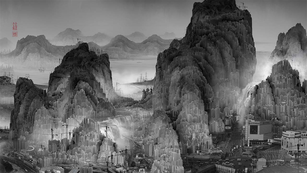 總結本展的最終作品,乃是楊泳樑(1980-)〈蜃市山水〉(圖15)。楊泳樑出生上海,專擅影像創作,其「蜃市山水」系列應該是他近年來最具話題性的創作。以傳統山水繪畫構圖為基底,利用數位技術取代箇中元素,例如山巒幽谷成為高樓大廈,或是層巖叢樹化成電桿機械。身處於無可避免的工商業推展、城市都會聚集及全球化進程中,當代社會生活距離往昔的理想自然環境越來越遠。尤其面對眼前棘手的空汙暖化等環保問題,我們是否能自古代山水藝術中獲得啟發?觀眾或許可從展覽裡找到回應。