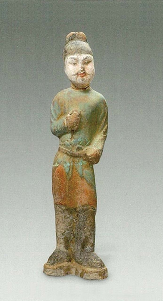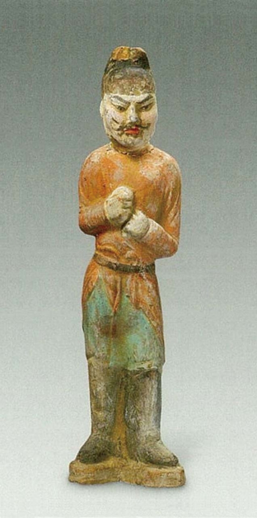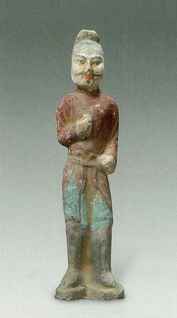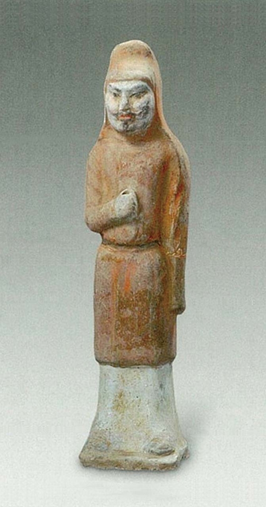 3.風帽俑修復4件,此選介1件。標本4366(圖7),頭戴橘紅色風帽,方臉塗白,高眉斜眼,長鼻紅口,唇上堆塑八字鬚,下巴塗短鬚,身穿橘紅色團領窄袖袍,下著白裙,露出靴尖,左手袖手下垂,右手握拳抱於胸前,雙足立於方形底板上。高29公分。