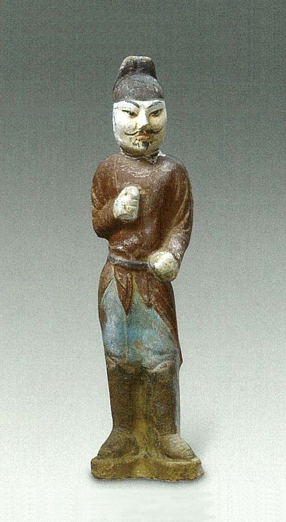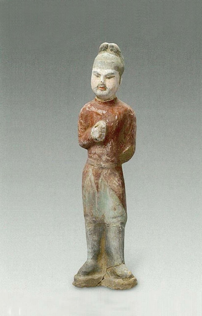 4.牽馬俑修復31件,此選介5件。標本4373(圖8),頭戴黑色短腳襆頭,方臉略抬,塗淡紅彩,復以黑彩塗濃眉、圓睛、八字鬚、短鬚,八字鬚堆塑而成,高鼻挺秀,紅唇一點,身穿鐵鏽紅色團領窄袖袍,腰束黑帶,袍前襟掖於帶內,露出藍色團領右衽襦,下著褲、高筒黑靴,雙手握拳,置於體前,做握韁狀,左腿略曲,與右腿略成丁字步立於三角形空心底板上,瞪視前方。高32.6公分。標本4381(圖9),容貌、服飾、舉止大致同前俑。頭略低,方臉塗白,描繪出短眉、黑睛、八字鬚、短鬍鬚,眼瞼斜長,雙拳塗白,左拳位置略偏上,左腿曲度較大,目視前下方。高32.6公分。標本4379(圖10),低首,頭戴黑色短腳襆頭,方臉略窄,塗白,又塗淡紅彩,再描出劍眉、斜眼、八字鬚、紅唇,八字鬚堆塑,下巴稍長,身著橘黃色團領窄袖袍,腰束黑帶,袍襟掖於帶下,露出藍色團領右衽襦,下著褲、高筒黑靴,雙手握拳於胸腹,雙腿較直,丁字步立於三角形空心底板上,目視前下方。高32.2公分。標本4382(圖11),與前俑比,長臉圓潤,粉面塗紅,鬚眉用筆描出,顯得年少俊逸,袍、襦顏色與前相反,兩拳分離,左膝略曲,丁字步立於三角形空心底板上,目視左前方,有點玩世不恭的樣子。高32公分。標本4380(圖12),臉稍短,敷彩同前,俊秀異常,著紅袍、藍襦、黑靴,右手握拳於胸部,左拳置腰側(殘),但拳與腰部沒接觸,臉向右扭,冷靜地注視著右前方。高32.6公分。