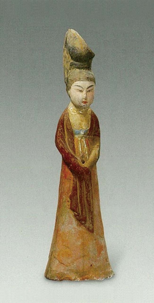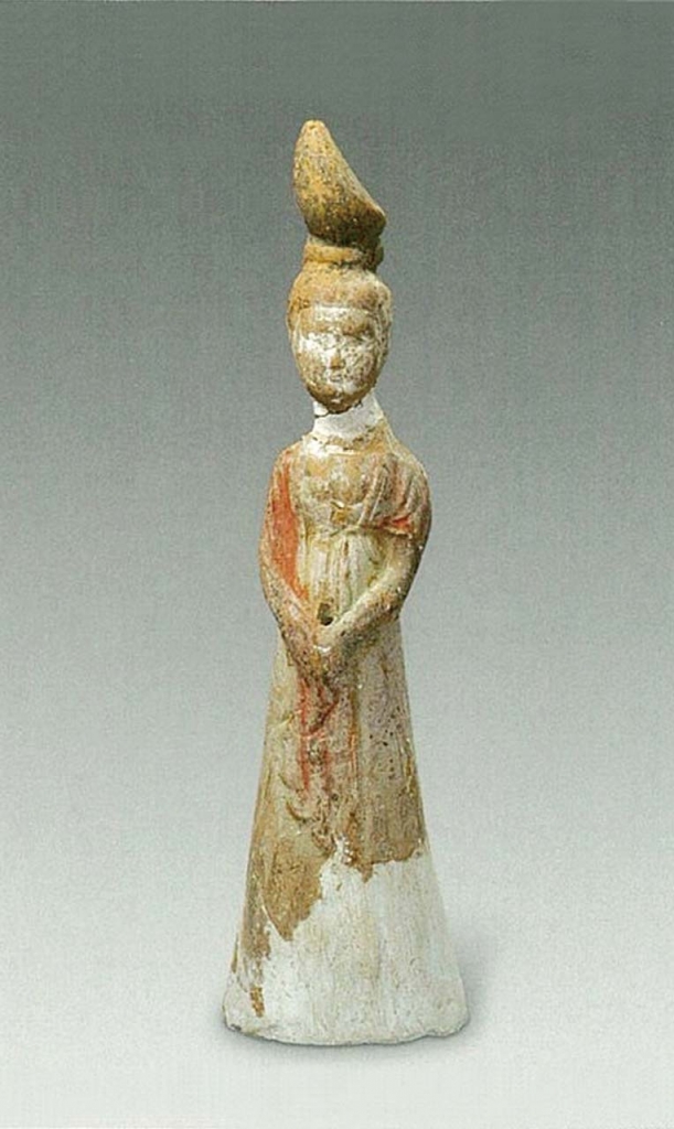 5.半翻髻俑修復3件,此選介2件。標本4355(圖13),頭梳半翻髻,圓胖臉,彎眉俏目,黑眸一點,滋潤面龐上有秀美的長鼻,紅唇緊閉,身著藍色低領窄袖襦,肩披鐵鏽紅長帛,繞肩遮臂垂於腹前,腋下束橘紅色曳地長裙,束裙白絲帶周匝顯眼,雙手相握於腹前,手中原持有物,面容沉靜似水,如有飛鴻掠過而波瀾不驚。高28.5公分。標本4383(圖14),容貌、服飾同前,脫彩嚴重,僅餘橘紅色披帛。高29.5公分。