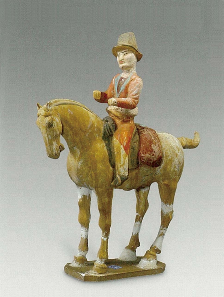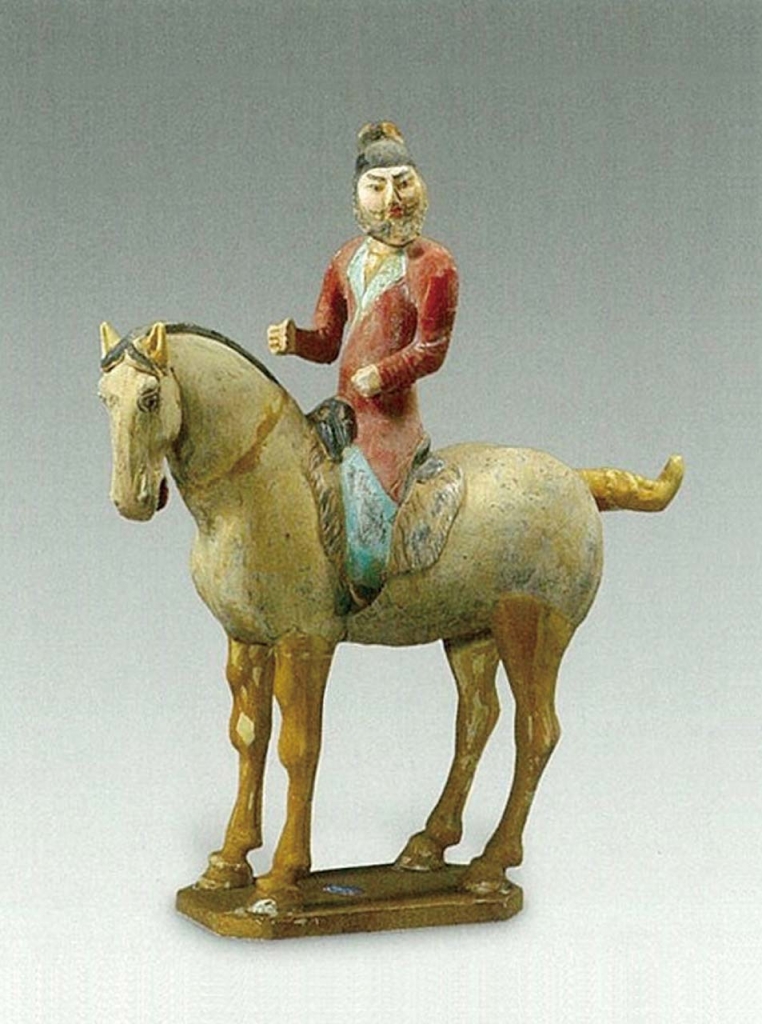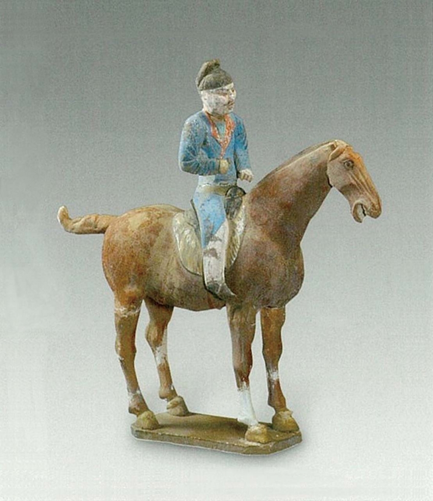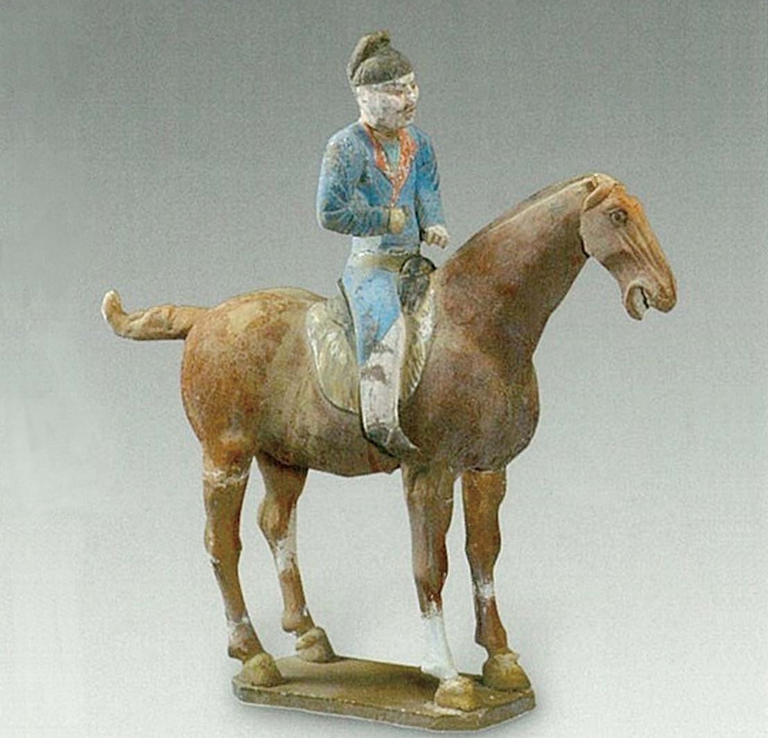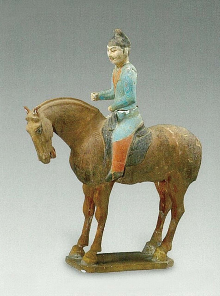 6.男騎俑修復15件,此選介7件。標本4422(圖15),紅馬昂首,揚脖,分纓,剪鬣,小立耳,雙眼炯炯有神,大嘴放情張開,平背,肥臀,束尾略長而翹,精神抖擻,四足立於底板上,背置黑鞍、虎紋韉。騎者頭戴黑色短腳襆頭,粉臉濃眉,高鼻深目,大嘴略張,唇上下有髭鬚,身穿藍色團領窄袖襦,外罩藍色翻領窄袖袍,下著白褲、黑靴,雙手握韁,歪頭左視。通高50.2公分。標本4421(圖16),白馬短尾下垂,身姿同前,背置黑鞍、紅色黑緣虎紋韉。騎者頭戴黑色短腳襆頭,寬短臉塗淡紅彩,黑彩描眉、眼、八字鬚,但絡腮鬍沒描,身著紅色翻領窄袖袍,下著白褲、黑靴,雙手握於腹前,面右而視。高50.2公分。標本4429(圖17),褐馬腿部塗紅彩,勾首,短垂尾,黑鞍、黑韉。騎者寬短臉塗白,黑彩描出眉、眼、八字鬚,身著藍色翻領窄袖袍,下著橘紅褲、黑靴,雙手握於腹前作勒韁狀,目視左下方。高50.6公分。標本4427(圖18),褐馬腿部塗紅,昂首翹尾,背置黑鞍、黑韉,鞍後搭黑色馱囊。騎者粉臉寬短,紅唇略翹,頭右扭,身著綠色翻領窄袖袍,腰纏鐵鏽紅色包裹,下著橘黃色褲、黑靴,雙手置腹前作握韁狀,目視右前方。通高50.2公分。標本4419(圖19),紅馬勾首,翹尾殘,背置黑鞍、白色虎紋韉。騎者容貌同前極相仿,抿嘴稍嚴肅,著藍袍、橘紅色褲,腰纏鐵鏽紅色包裹,顏色更豔,雙手作握韁狀,身略前傾,目視左前方。通高51.6公分。標本4426(圖20),黃馬勾首,纓、鬃塗黑,黑鞍、黃色虎紋韉,翹尾長伸,臀後挫明顯。騎者頭戴黑色短腳襆頭,圓臉豐潤,粗眉斜挑,明眸有神,高直鼻樑十分挺秀,紅唇上八字鬚飄至腮旁,頜下塑出抵耳絡腮鬍鬚,著紅色翻領窄袖袍,下著藍褲、黑靴,雙手握拳置腹前作握韁狀,上身較直,目視左前方。高50.5公分。此俑人馬的精氣神兒明顯高出其它騎俑一籌,馬眼神含蓄,嫻雅靜美,人朗目乾坤,儀態萬方,堪稱天人合一的作品。標本4423(圖21),黃馬身姿同前,背置黑鞍、黑韉,韉後搭鐵鏽紅色馱囊。騎者頭戴席帽,緊眉蹙眼,塌鼻樑,寬顴骨,紅唇外翻,下巴前凸,容貌較醜,應為胡人。內著鐵鏽紅團領窄袖襦,外著橘紅色翻領窄袖袍,腰纏黑色長包裹,下著白褲、黑靴,雙手半舉腹前作握韁狀,歪眉斜眼,目視前方而行。高52公分。