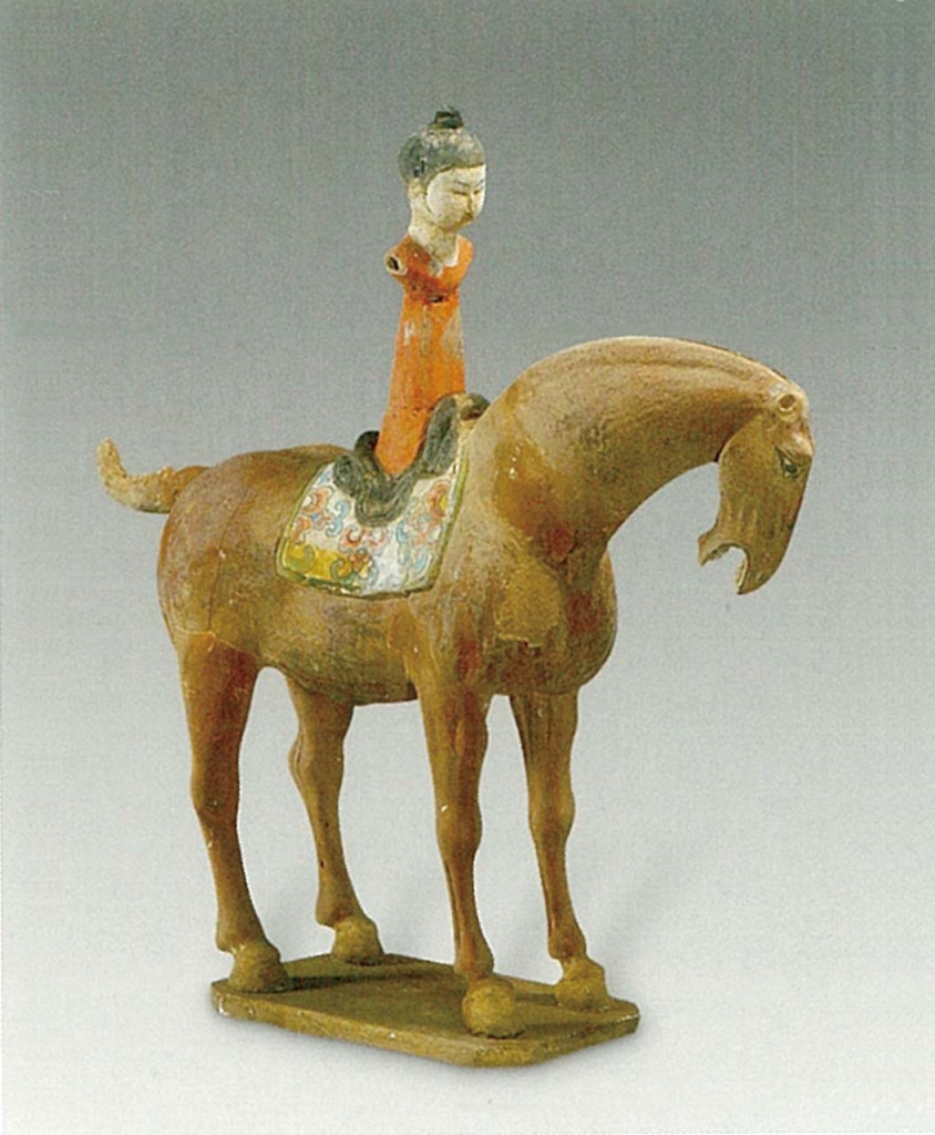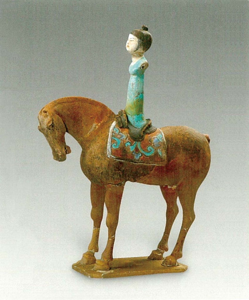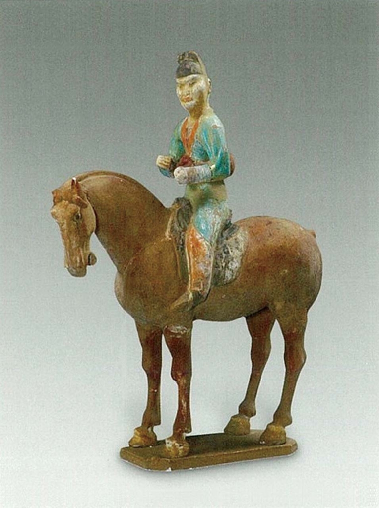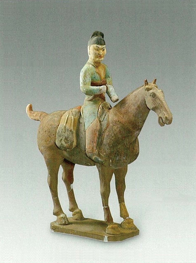 韋貴妃墓陶俑種類主要有鎮墓獸、武士俑、風帽俑、牽馬俑、半翻髻俑、男騎俑、女騎俑、馬俑等,與這一時段其它唐墓相比,少了不少種陶俑。男俑裡不見文官俑、籠冠俑、拱手襆頭俑,僅見風帽俑;女俑裡不見椎髻俑、條髻俑、雙環髻俑,僅見半翻髻俑;唐墓裡常見的雞、羊、豬、狗等小型俑也沒有。一般來說,墓葬盜擾只會打碎陶俑而不帶走,韋貴妃墓墓室見到許多破碎陶俑就屬於這種情況,但墓內陶俑種類不夠的原因,不能確指。另外,書中所謂的男立俑衣襟掖在帶內,與河北、河南唐墓中一般只出一件的牽馬俑風格相同,陝西除了韋貴妃墓修復這種俑31件,669年西安劉智夫婦墓(註2)也出了34件,我們認為這種俑還是稱為牽馬俑為好。書中又認為女騎俑有組裝的腿,從體形來看,女俑的腿掩於裙內,這種騎法高超的女俑在其它唐墓中還沒見過。總之,韋貴妃墓隨葬陶俑有許多耐人尋味的地方,值得以後發掘高等級墓葬時注意。